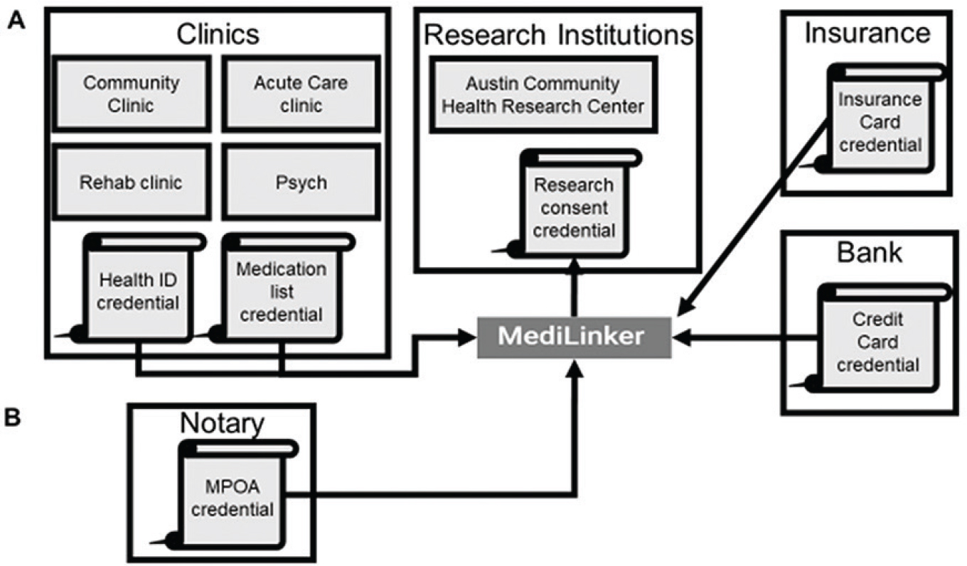 Fig. 1. MediLinker network of trust and credentials. (A) MediLinker framework creates a network of trust in which verifiable credentials [Health ID, medication list, insurance card, credit card, and medical power of Attorney (MPOA)] are issued by participating institutions, including clinics, insurance, and bank. Once a credential is issued, users can share these verifiable credentials within the MediLinker application to other participating institutions. Research institutions received consent credential from participants. (B) MPOA credentials issued by a Notary organization.
