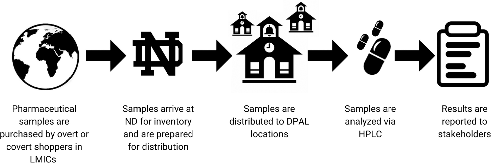 The Distributed Pharmaceutical Analysis Lab leverages the testing capacity of academic institutions in the US and abroad, including LMIC institutions to test drugs sourced from LMICs. The major players in the DPAL workflow include the coordinators at each collection site, the DPAL manager at ND, the site coordinator and analysts at each DPAL site, and stakeholders, such as pharmaceutical regulatory agencies.