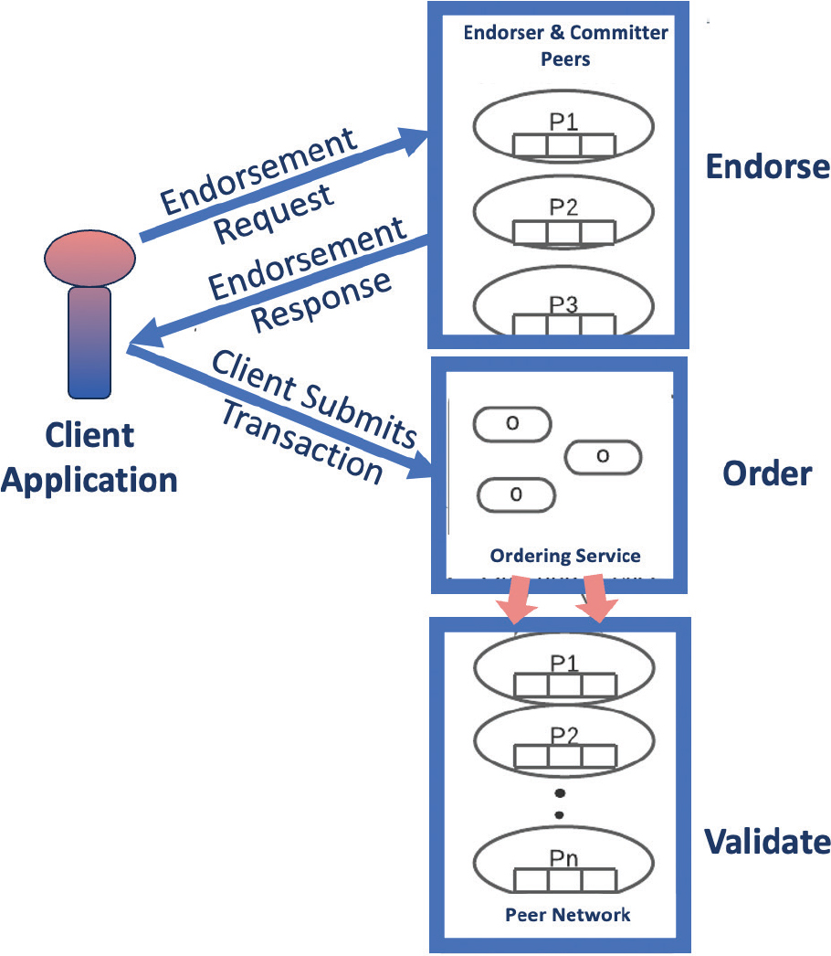 Whenever the client has a transaction request (Figure 3), an endorsement by the respective endorsers takes place according to the policy. Then, the orderer orders the block and copies the committing peers so all peers get a copy of the latest transaction.