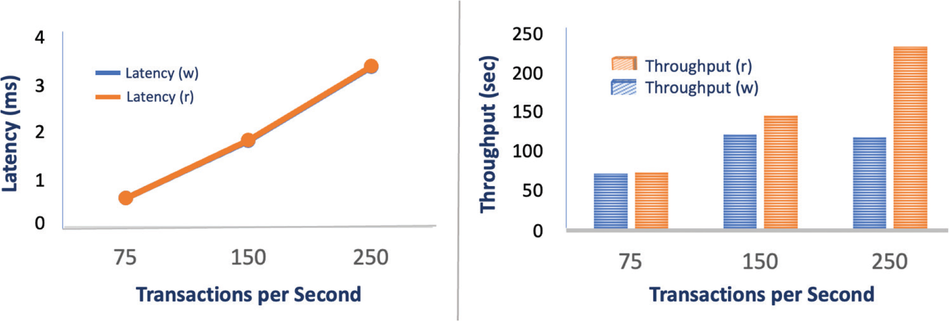 Fig. 8. Evaluation of the impact of transaction numbers, TPS (transactions per second) = 75 from Tables 2 and 3, Org (organization) numbers = 5: Latency and Throughput in Create and Write operations.