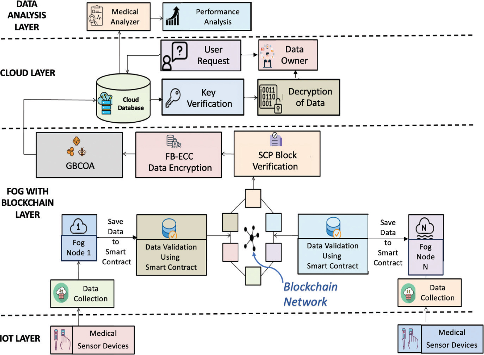 Four levels may be detected in this infrastructure: the IoT layer, the fog with blockchain layer, the cloud layer, and the data analysis layer. Patients’ health information is acquired utilizing medical sensor devices. With wired or wireless accessible media, including ZigBee and Wi-Fi, every IoT medical equipment may be linked to a single Fog node. Fog nodes impose preset protection standards to control connected IoT devices and services, as well as serve as an intermediary between the Cloud and the Blockchain, allowing authorization index for information queries.