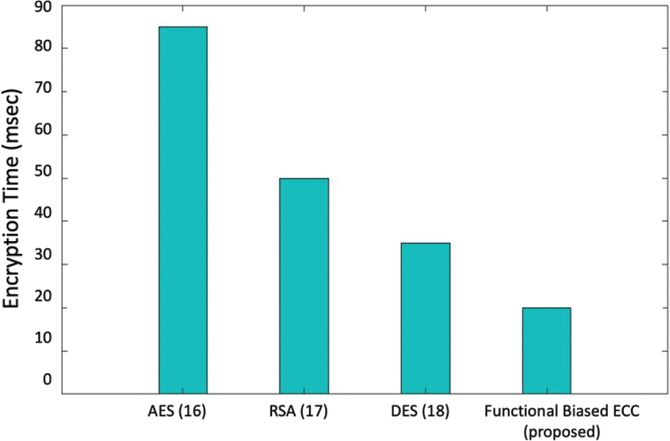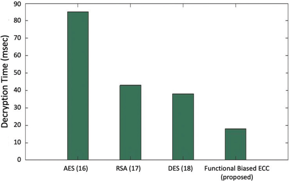 Figure 3 displays the suggested technique’s encryption time utilizing the functional biased ECC method. Researchers discovered that encryption time improved as the number of bits in the key became larger. Our suggested architecture, on the other hand, takes much less time to encrypt than traditional approaches like Advanced Encryption Standard (AES), Data Encryption Standard (DES), and Rivest-Shamir-Adleman (RSA).
