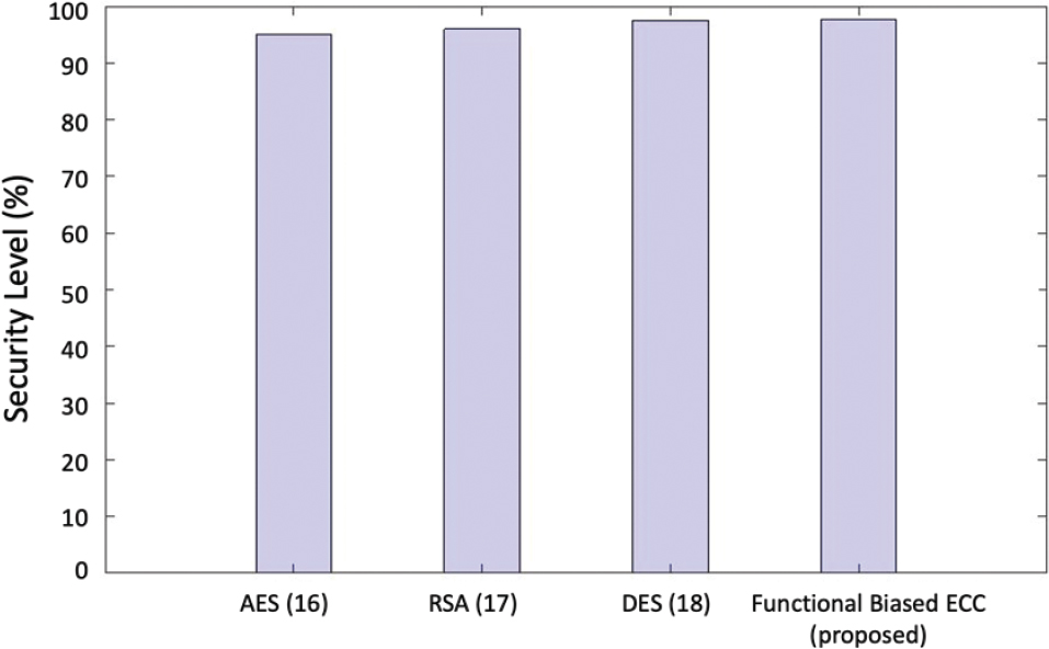 Figure 6 compares the proposed functional biassed ECC to conventional secure storage algorithms like DES, RSA, and AES in terms of security level. In comparison to traditional methodologies, the presented alternatives offer a higher degree of security.