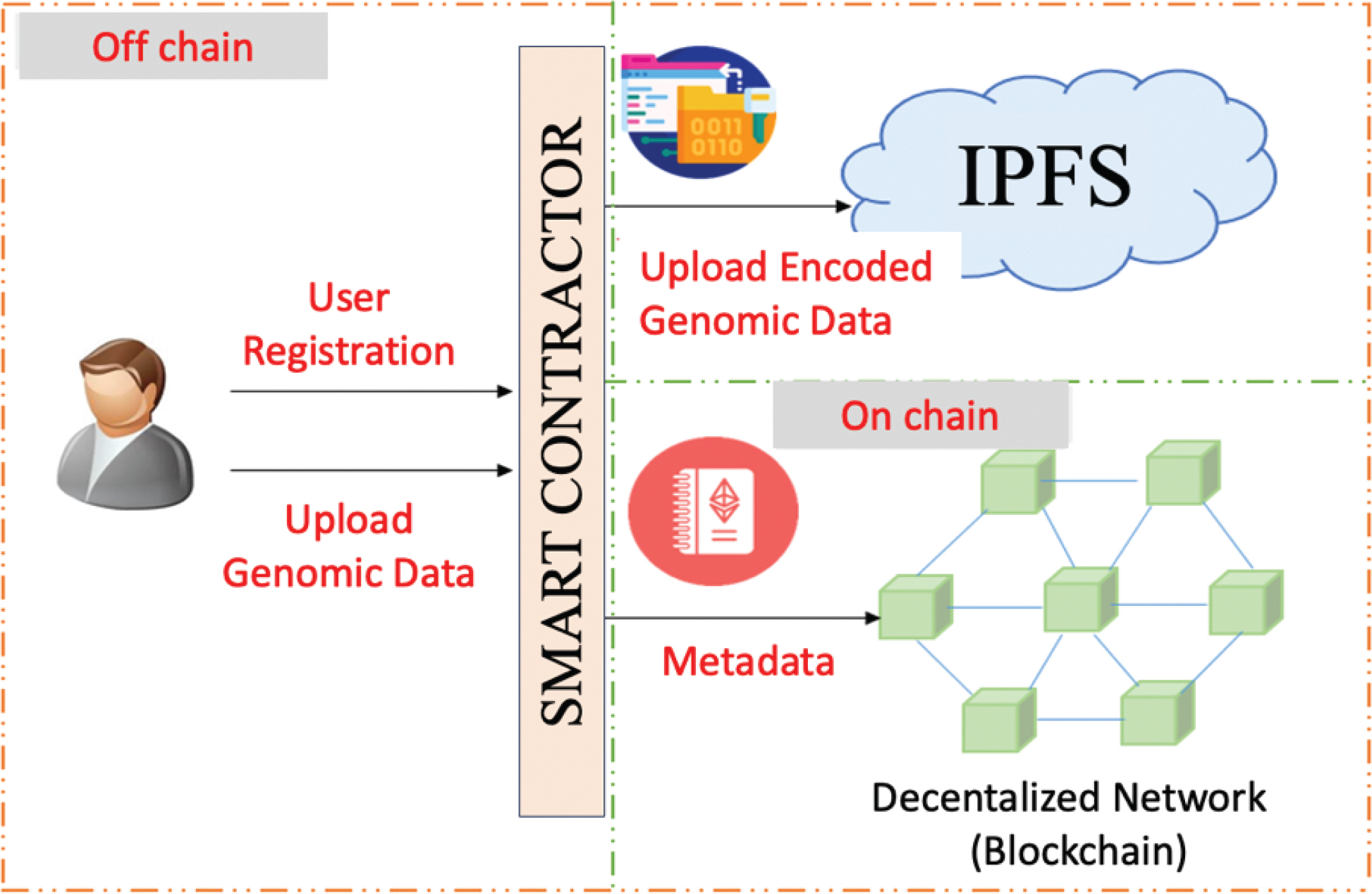 Figure 2 illustrates a hybrid blockchain-based architecture designed to enable privacy-preserving and secure sharing of genomic data. The process begins with the registration of the user and providing their genomic data through a smart contract, which acts as a bridge between the user and the system. Once uploaded, the genomic data are encoded and saved off-chain within IPFS—an off-chain storage system that reduces the blockchain load and allows for effective storage of large data files. Meanwhile, the metadata (e.g. data hash, access rights, and ownership) are accessed by the smart contract and stored on-chain in a decentralized blockchain network, ensuring transparency, immutability, and traceability. Off-chain data storage and on-chain metadata are enhancing data privacy as well as system scalability with the possibility of still maintaining a verifiable connection between the user and his/her genomic data. This new structure ensures that genomics data that is sensitive is not openly revealed on the blockchain, thus maintaining the user’s confidentiality but having access to the most secure elements of blockchain.