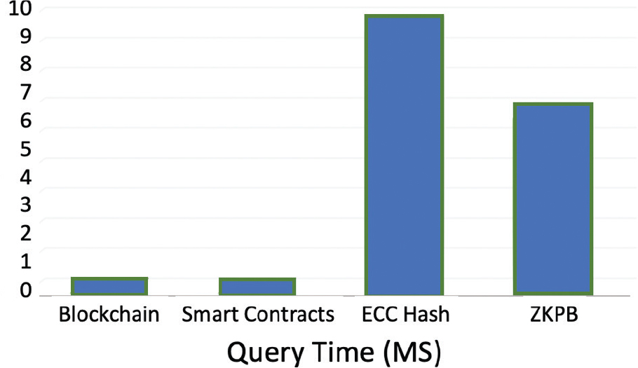 Fig. 9. Query time performance comparison of crypto techniques. ZKPB: zero-knowledge proof blockchain; ECC: elliptic curve cryptography.