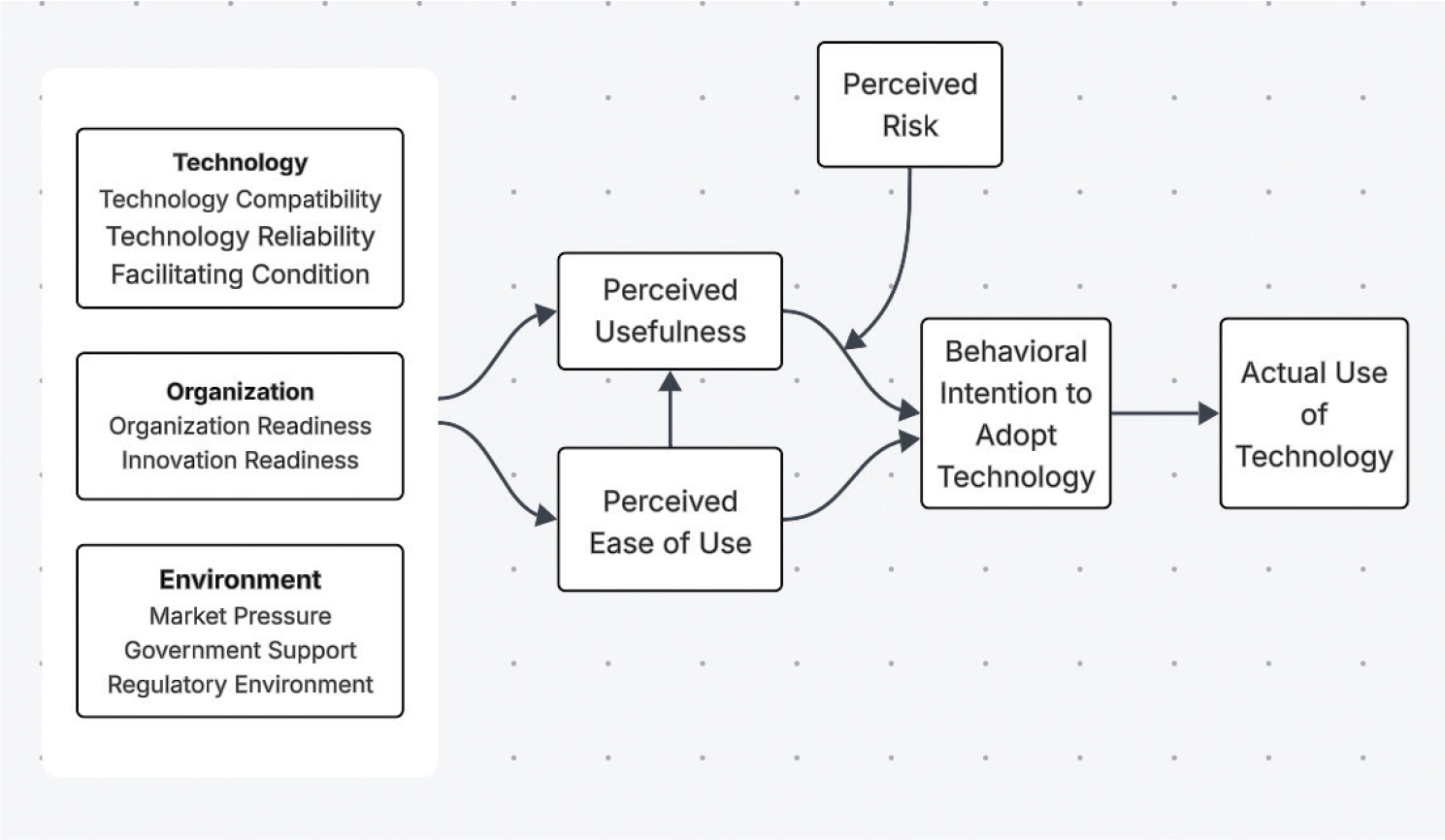 In the context of blockchain technology in health care, the TOE and TAM can be used to investigate what variables affect healthcare organizations’ openness and adoption of new technologies.25 Hence, to meet the objective of this study, an integrated TAM-TOE framework has been proposed. Compared to the TAM, which analyzes technology adoption at the individual level, the TOE26 framework has been found to be the most robust and widely used adoption model in the technology adoption literature10 and was classified as an organizational-level theory. Integrating the TAM and TOE frameworks provides a more robust theoretical lens, allowing for the simultaneous analysis of individual user attitudes, organizational dynamics, and external environmental pressures.27
