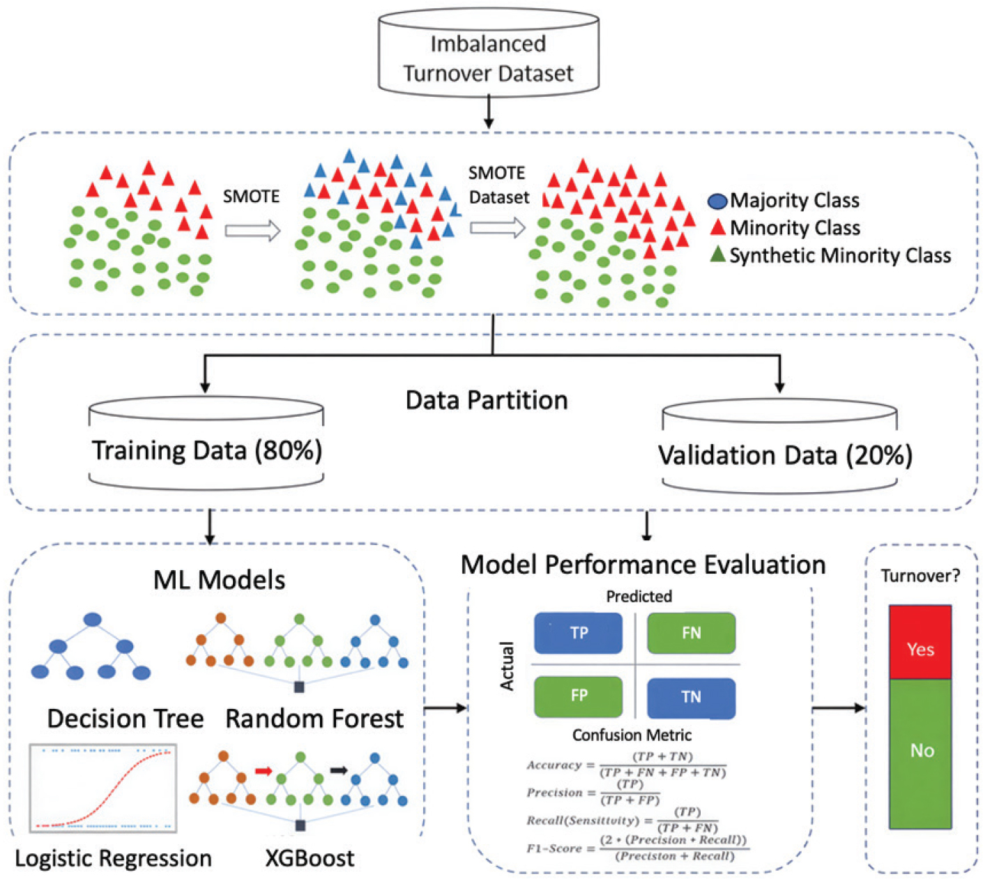 The overall theoretical model is shown in Figure 1, which illustrates a complete ML modeling process for hospital attrition prediction. First, from the original attrition dataset characterized by category imbalance, the minority class (departing employees) is expanded using SMOTE to generate new synthetic samples to alleviate the category imbalance problem. Subsequently, the balanced data are divided into a training set (80%) and a validation set (20%) for model training and performance evaluation. In the model construction phase, several classical supervised learning algorithms, including Decision Tree, Random Forest, Logistic Regression, and Extreme Gradient Boosting Tree (XG Boost) are used to binary classify the modeling of whether employees turnover or not. After the model training is completed, the model performance is comprehensively judged by constructing a confusion matrix and evaluating metrics such as prediction accuracy, precision, recall, and F1 score. Finally, the model labels each employee as “Yes” or “No” and presents them in color differentiation, providing HR managers with visual early warning decision support.
