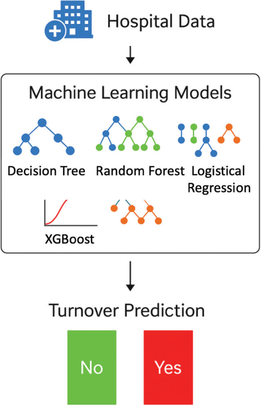 Current literature reflects a growing interest in predictive modeling of employee turnover using ML algorithms. For instance, classification methods such as logistic regression, decision trees, and ensemble models like random forest or Gradient Boosting Tree (XG Boost) have been applied across sectors including education, business, and government.9 In the healthcare domain, most prior studies focus on clinical outcome predictions, patient readmission, or disease risk stratification, while comparatively fewer works have addressed human capital dynamics within hospitals.10 Even among existing attempts, key limitations remain, including (1) severe class imbalance due to low attrition rates skews model performance, (2) psychological and behavioral factors, such as beliefs about fate or workplace identity, are often ignored, and (3) most frameworks lack practical implementation mechanisms for real-time warning and intervention.