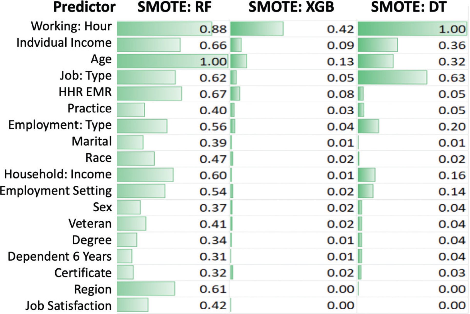 Figure 4 demonstrates the results of comparing the importance scores of each feature variable when using three ML models (Random Forest RF, Gradient Boosting Tree XGB, and Decision Tree DT) for hospital brain drain prediction on SMOTE oversampled processed data. Overall, Working Hour is shown to be a core predictor in all models, especially in the Random Forest (SMOTE_RF) and Decision Tree (SMOTE_DT) models, with a score of 1.00, indicating that it plays a dominant role in predicting employee turnover. In addition, Individual Income and Age also have high importance in the SMOTE_RF model (0.66 and 1.00, respectively), but are relatively weak in the XG Boost model, at 0.09 and 0.13, suggesting that their contribution to the nonlinear model is limited. Further comparisons revealed that Job Type (type of position) and EHR_EMR (whether or not to use electronic medical records) also had some explanatory power in the Random Forest model (both exceeding 0.6), while presenting marginal effects in the XGB and DT models. Practice (whether or not to participate in practice) and Employment Type (type of employment) ranked in the SMOTE_RF model ranked in the upper middle of the list, but were significantly less important in the other models.31