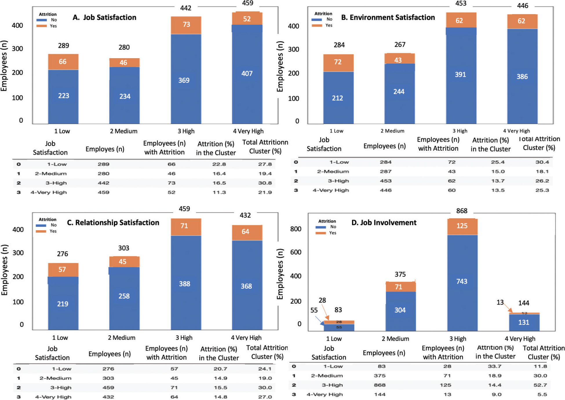 Figure 5 consists of four subfigures showing the impact of different satisfaction or engagement dimensions on hospital employee turnover: including (a) Job Satisfaction, (b) Work Environment Satisfaction, (c) Relationship Satisfaction and (d) Job Involvement. Each subfigure presents the number of employees’ turnover (Attrition = Yes) and retention (Attrition = No) at different satisfaction levels in the form of stacked bar charts, supported by detailed data tables at the bottom. First, as can be seen in Figure 5(a), the higher the job satisfaction level, the lower the employee turnover rate.