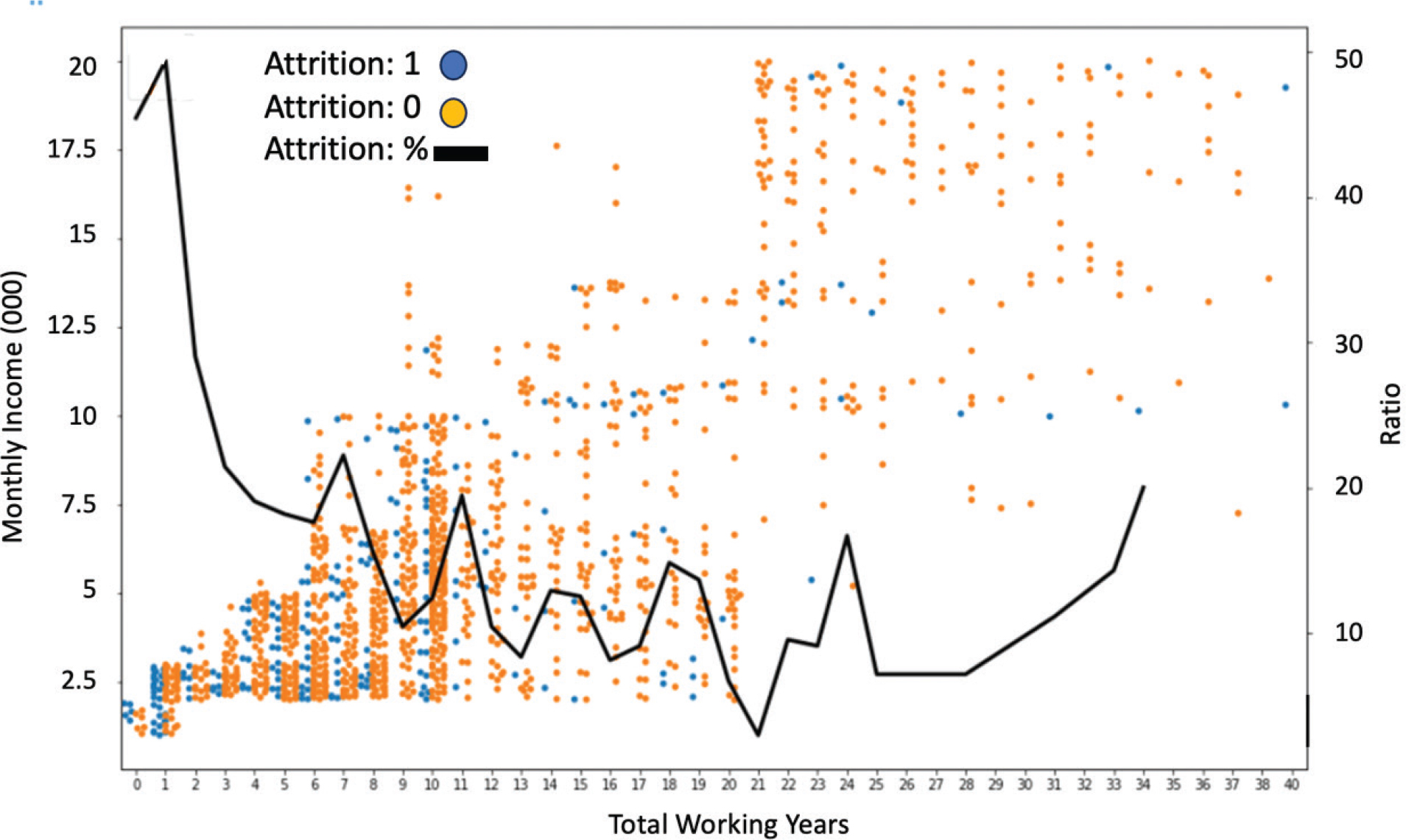 Figure 6 presents a combination of scatter and line graphs showing the attrition of hospital employees across Total Working Years and Monthly Income, with the trend in attrition rate (Attrition %) for each working year indicated by the black line. Each scatter in the figure represents one employee, where orange color indicates no attrition (Attrition = 0) and blue color indicates attrition (Attrition = 1). As can be observed in Figure 6, employee turnover is highest in the early years of employment (1 to 3 years), with more than 45% turnover in the first year. At this stage, although some employees have higher monthly income, most of them are concentrated in the lower income limit range, indicating that the lack of a match between salary and job may be the main reason for turnover. As the length of service grows to the 5th~10th year, employees’ income gradually increases, and the turnover rate generally shows a decreasing trend, reflecting increased career stability. However, in the range of 10~20 years of working experience, there are multiple dense distribution areas in the graph, with a large span of monthly income, but the turnover rate fluctuates irregularly, suggesting that mid-term employees’ willingness to turnover may rise again in the face of bottlenecks in job promotion, burnout, or external opportunities. It is worth noting that after more than 20 years of service, despite the generally higher income of employees, the proportion of turnover declined significantly, and most of the employees stayed on steadily, possibly with positions close to retirement.