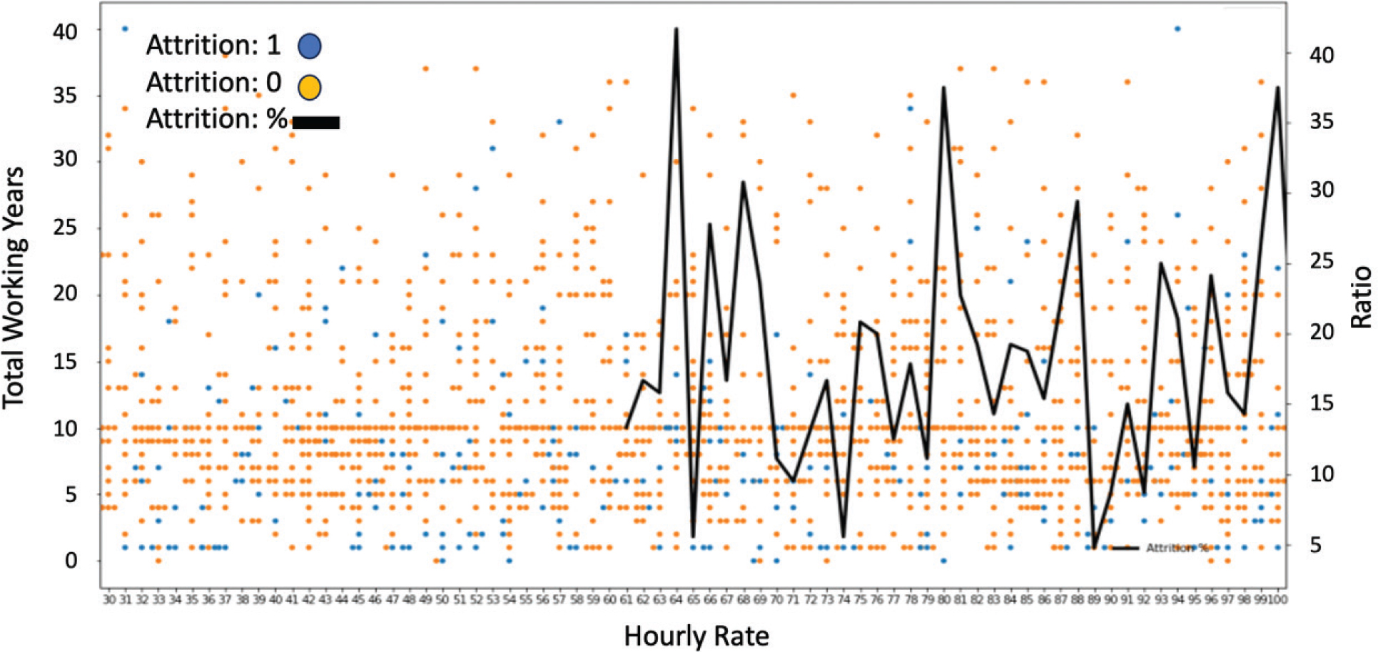 Figure 7 shows the distribution and trend of hospital employee turnover under different Hourly Rate and Total Working Years in a combination of scatterplot and line graph. Each point in the scatter plot represents an employee, with orange indicating no turnover (Attrition = 0) and blue indicating turnover (Attrition = 1). The black line represents the percentage of employee turnover at the corresponding hourly rate (Attrition %). Overall, the trend suggests that an increase in hourly wage does not have a clear linear effect in reducing turnover. In the range of $30–$60 hourly wage, the attrition rate is at a low to medium level with relatively small fluctuations. And from $61 or above, the turnover curve shows an obvious oscillating upward trend, and a number of turnover peaks, indicating that the tendency to turnover of some employees with high hourly wages is higher instead. Especially in the corresponding ranges of $65, $81, $88, and $100, the turnover rate exceeds 30%, suggesting that there is a characteristic of “high mobility and high job-hopping” among the high-wage group, which may be related to the scarcity of jobs, external attraction, or expiration of contracts.