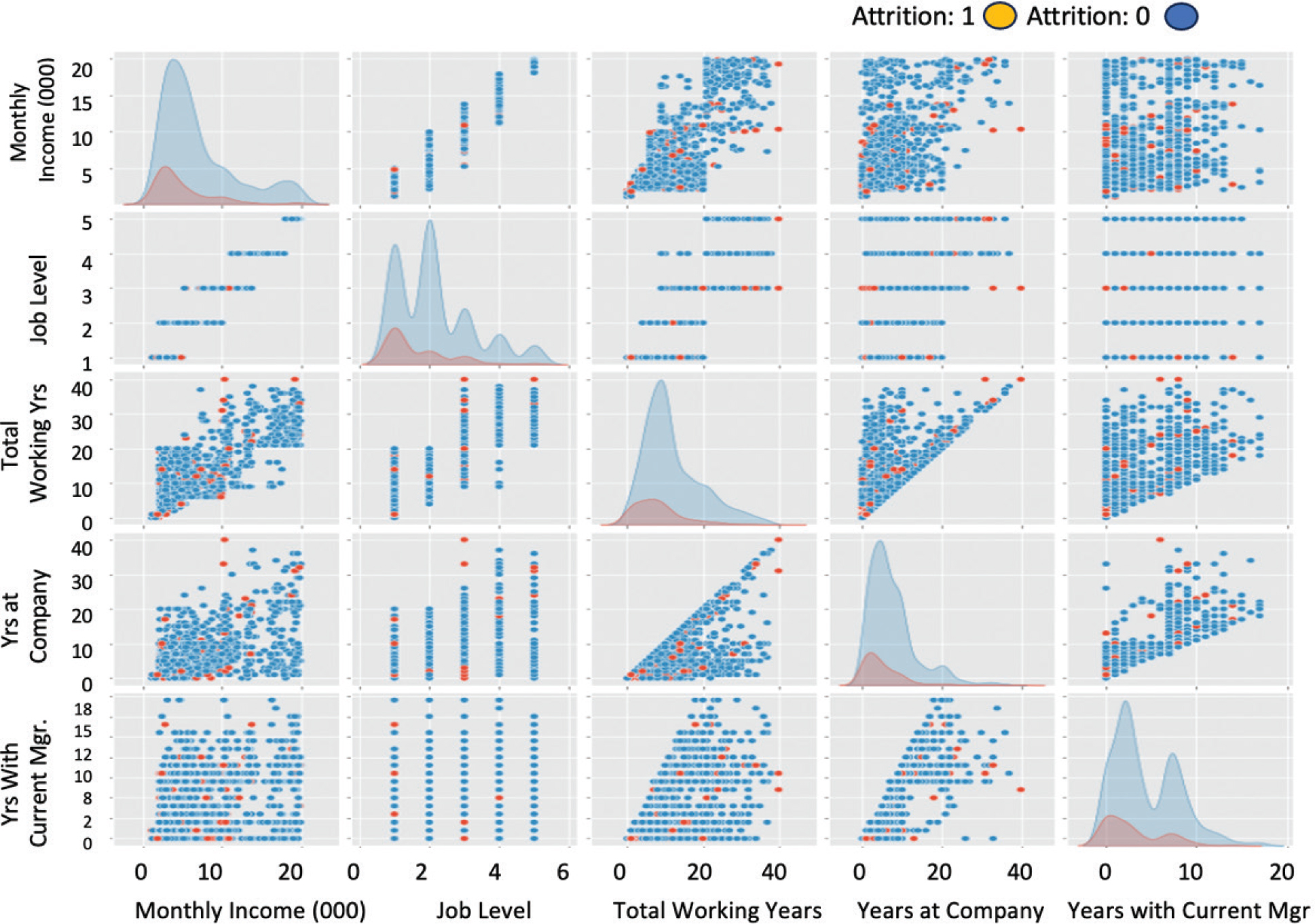 Figure 8 illustrates the joint distribution and interrelationships of hospital employees on five key continuous variables: Monthly Income, Job Level, Total Working Years, YearsAtCompany, and Years with CurrManager. The scatter dots of different colors in the figure indicate whether or not there is a turnover (red indicates turnover, blue indicates no turnover), the diagonal line is the kernel density distribution curve of each variable, and the off-diagonal line is the joint distribution relationship of scatter dots between variables, which can intuitively reveal the characteristics of the distribution of turnover of employees in the dimensions of different variables. From the diagonal density distribution curve, it can be observed that the density peaks of lost employees (red) in monthly income, job level, and total years of service are generally to the left, indicating that most of the lost employees are concentrated in the low-income, low job level and early career stage. Comparatively, the distribution of non-turnover employees is wider, with a higher proportion in higher income and length of service ranges, indicating that the willingness to turnover decreases with experience accumulation and job promotion.
