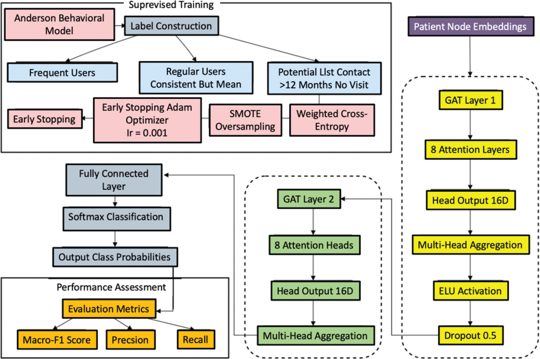 Fig. 4. Patient service classification model based on GAT. GAT: graph attention network; SMOT: Synthetic Minority Oversampling Technique.