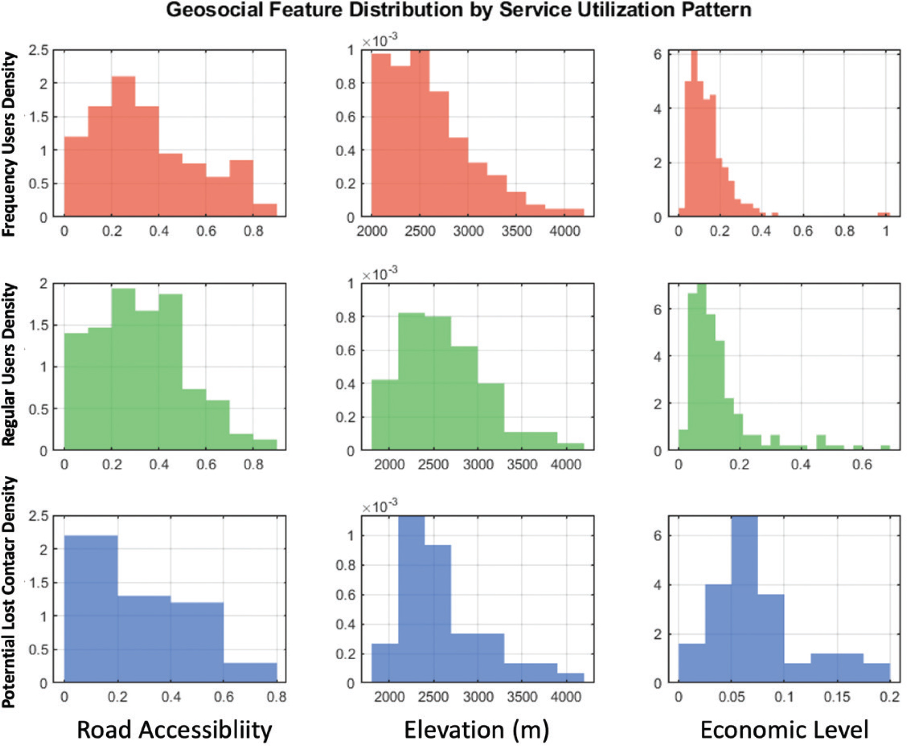 Figure 5 illustrates the distribution of three patient types (high-frequency patients, regular patients, and potential lost contacts) across three geo-social characteristics: road accessibility, altitude, and economic level. The X-axis represents the corresponding characteristic value, and the Y-axis is the sample frequency. Overall, those who frequently seek medical treatment (red) have a higher mean road accessibility, indicating that convenient transportation may promote high-frequency medical treatment behavior. The road feasibility of potential lost patients is relatively dense at around 0.06, revealing that the disadvantaged groups in road traffic are prone to be out of the service system; the altitudes of the three types of patients are all distributed between 2,000 and 4,000, reflecting that the patients are at a higher altitude; in terms of economic level, the economic level of potential lost patients is relatively dense at around 0.06, which is lower than that of regular and frequent medical treatment seekers, revealing that economically disadvantaged groups are more likely to be out of the service system.
