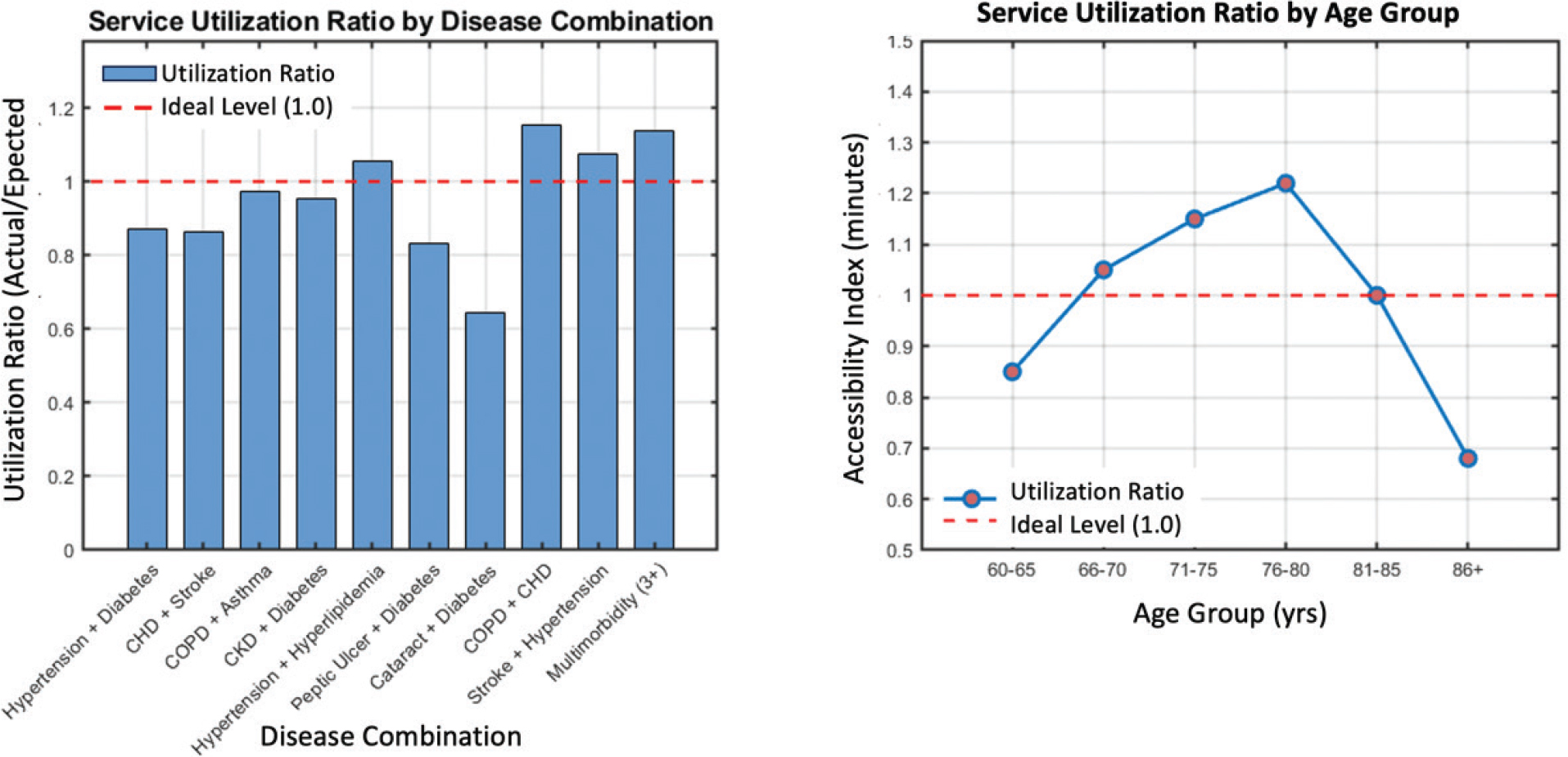 Figure 8 illustrates the utilization rates of different chronic disease combinations and elderly age groups in northwest Yunnan, reflecting the service matching status of multimorbid older adults. Overall, most combinations show slightly lower-than-expected visit frequencies, indicating insufficient service coverage. The “Cataract + Diabetes” group has the lowest utilization rate (0.645), suggesting poor attention to vision-related complications. In contrast, the “Multimorbidity (>3+)” group shows a high rate (1.138), reflecting adequate service matching and a resource bias toward severe cases. The “COPD + CHD” combination (1.152) indicates mild overuse, likely due to overlapping respiratory–cardiovascular symptoms. By age, utilization rises to a peak of 1.22 among those aged 76 to 80 years but declines to 0.68 in those >86 years, implying reduced access due to mobility and care constraints. These findings highlight structural imbalances in regional resource allocation and the need for age- and disease-specific service optimization.