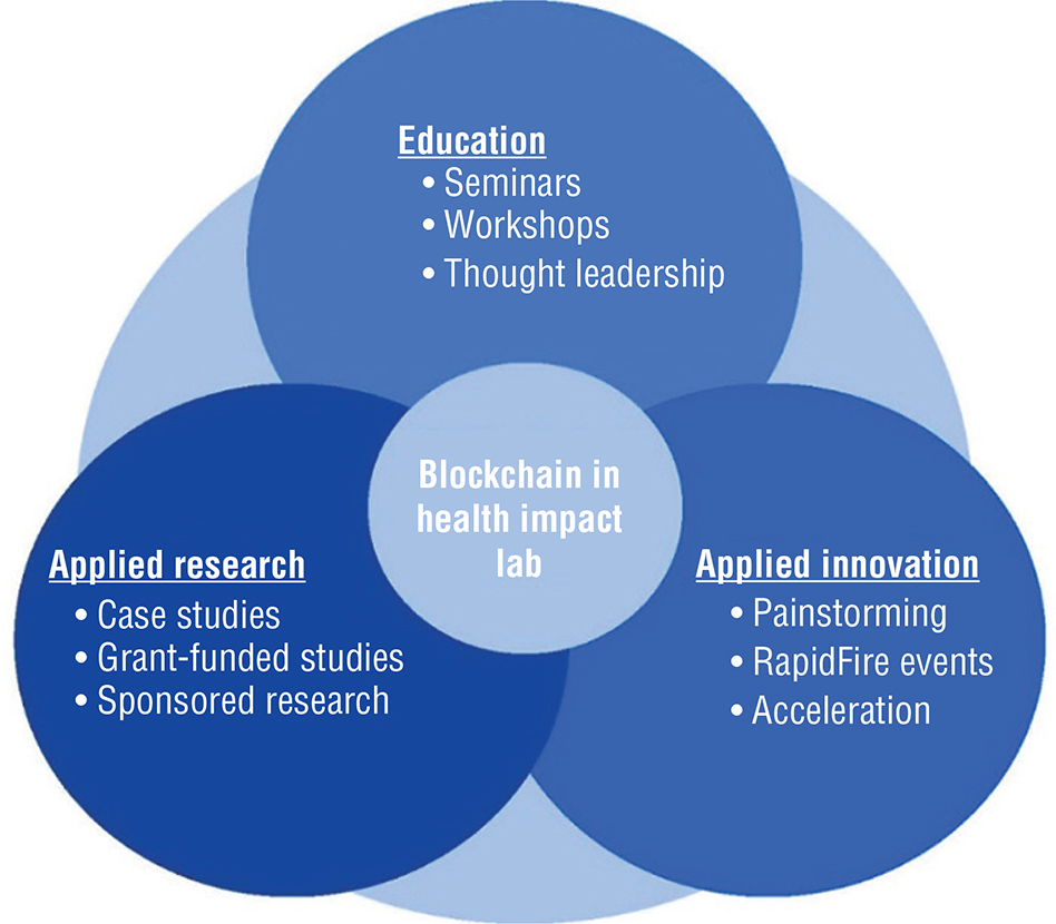 Anecdotally, the team had received insights from leaders in healthcare that the high risks involved in testing new technology, combined with the lack of reviews and case studies from impartial organizations, lead to reluctance of testing blockchain solutions in the clinical setting, especially involving patient data. This prompted the team to set out to determine if and how a collaborative lab located at an academic medical center could serve as a convener and subject matter expert to identify opportunities, conduct research, and test solutions in a collaborative environment. We developed a research and development program to study factors that will support research, education, and innovation using blockchain technology for health in an effective and sustainable manner. The research focused on qualitative methods to collect data that helped identify key barriers and opportunities for developing a sustainable research lab that generates research, education, and application of blockchain in healthcare at an academic medical institution and tests those strategies in a real-world scenario.