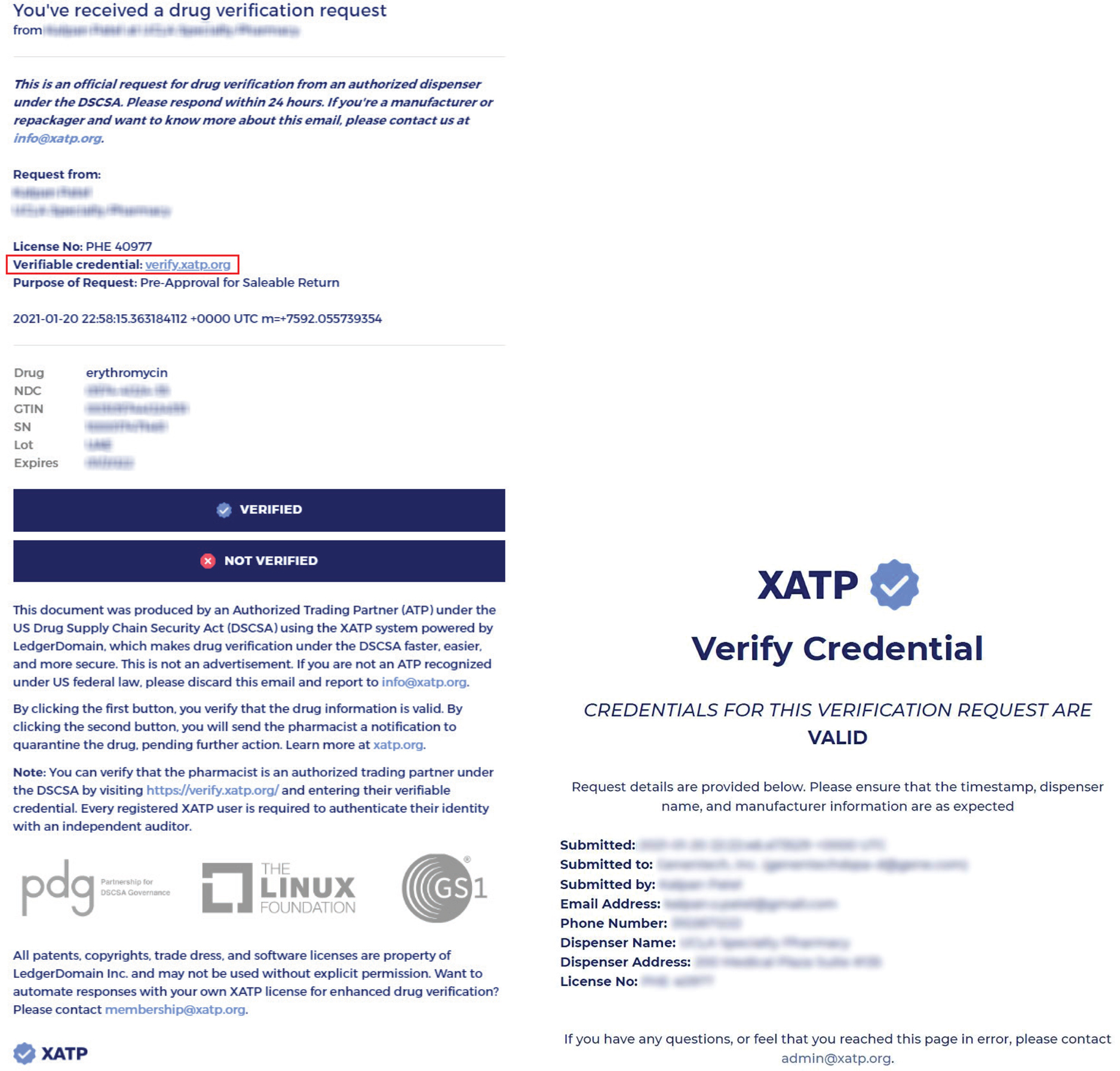 Outside the pharmacy workgroup, other ATPs were proven able to interact with the XATP framework using email clients and web browsers, without the need to install new software or create accounts. Manufacturers received verification requests signed with verifiable credentials, which could be independently authenticated, and were able to respond with the click of a button. Dispensers generated supporting documentation in the form of Product Verification Certificates, which were also independently verifiable.