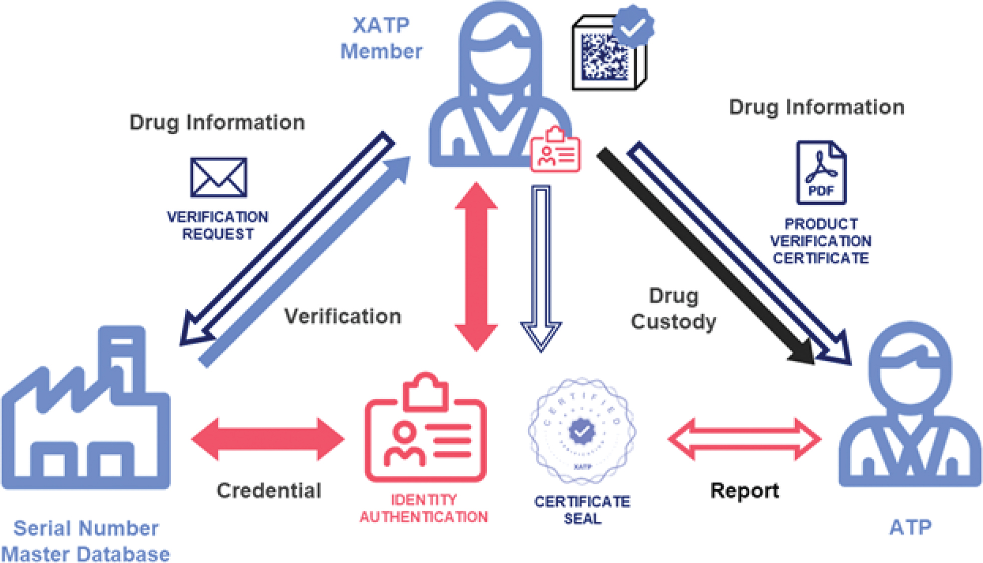 Critically, by ensuring that private keys are held by stakeholders as part of a robust identity system, the XATP framework mitigates the single-point-of-attack risks of legacy providers, where the keys to responder databases are often held and pooled. Much like a janitor’s keyring, which grants access to every room in a building, a single security breach in such systems might allow attackers to hijack other identities, create false identities, or gain access to confidential data (24, 25, 26, 27). By allowing for passwordless access closely associated with a device, XATP also sidesteps the risks associated with passwords, including sharing, leaks, and sharing passwords across multiple services (28, 29, 30). The XATP framework thus mitigates the risk for stakeholders to rapidly attain compliance with DSCSA obligations, such as drug verification, and sets a path for greater interoperability leveraging verifiable credentials (31) in the broader healthcare community.