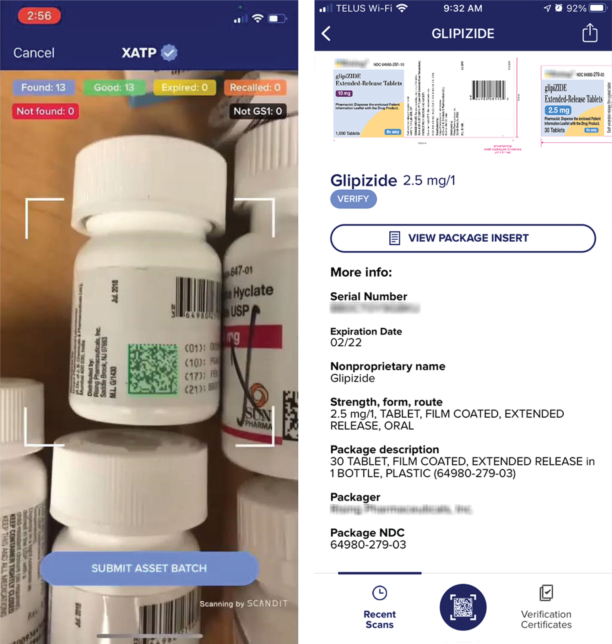 Fig. 3. (Left) Genuine barcodes being scanned at the pharmacy. (Right) The scanned drug in the XATP app.