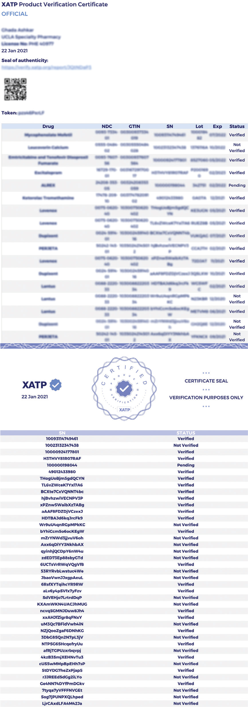 The Certificate Seal includes a list of drugs and their verification statuses, but contains only truncated drug information (22). Certificate holders have the ability to access the Seal and compare it with the data on the Certificate, making it possible to ensure that their Certificate is genuine and untampered. The authors employed Certificate and Seal for analysis of the study results, and found that the former could be successfully authenticated by the latter.
