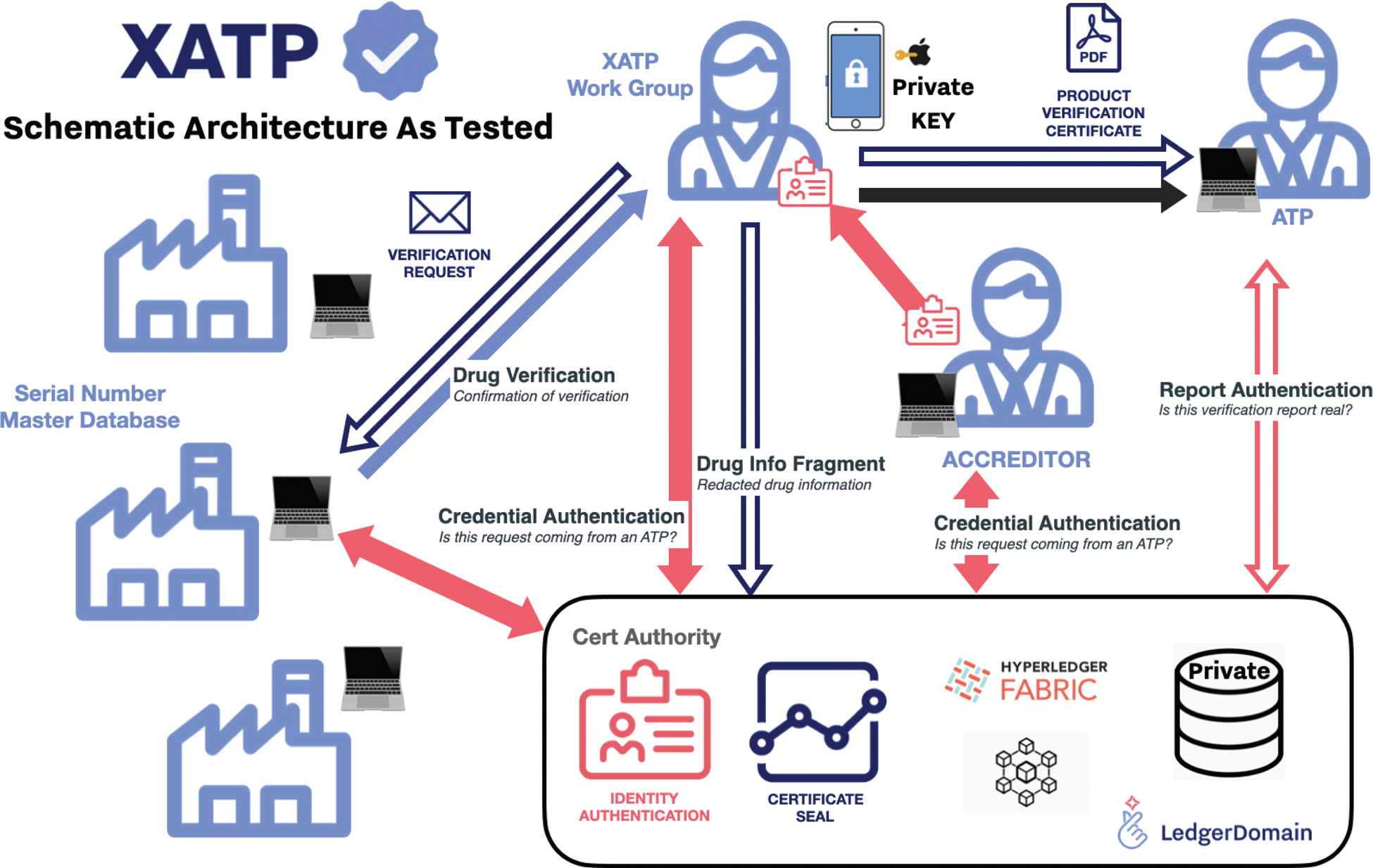 The LedgerDomain team developed the XATP framework in collaboration with the other members of the XATP Working Group. UCLA Health tested the framework with genuine drugs at the specialty pharmacy. Amgen verified drugs as a participating manufacturer. All authors contributed to the conception, development, and writing of this research article.