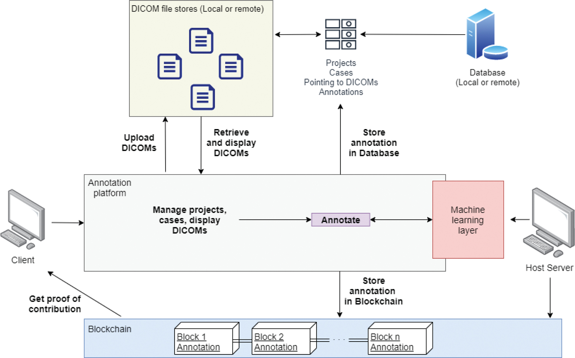 Fig. 1. High-level data flow of MarkIt. Blockchain ledger storage and access are separate from the regular database. Artificial intelligence interface allows to train new models based on gathered annotations and make annotation suggestions to speed up the workflow.