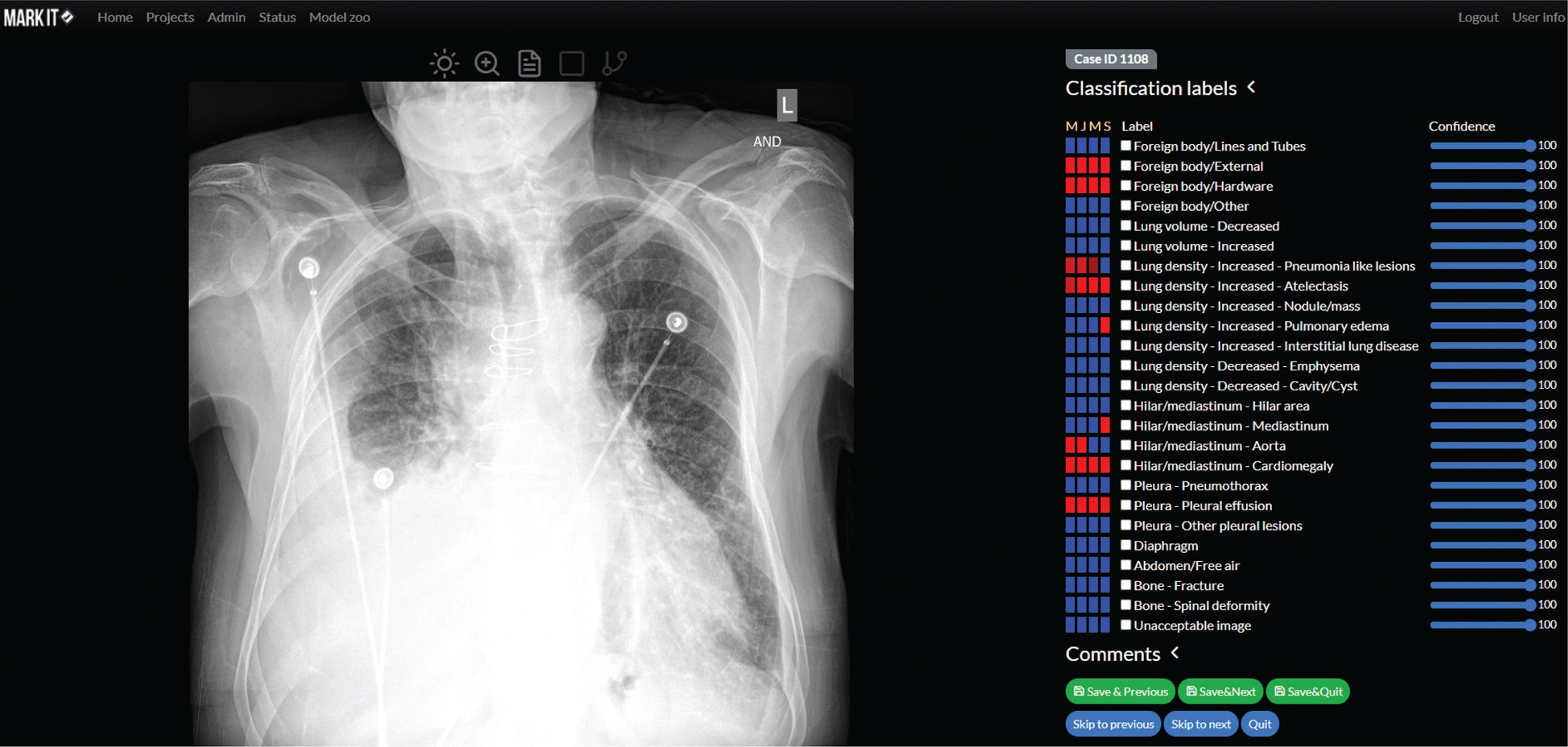 Fig. 2. Main module for image annotation combining basic DICOM viewer features (i.e. change brightness or contrast, zooming, etc.), displaying radiological reports and annotation tools (above the X-ray image). Annotators can determine their confidence with regard to each label (blue bars on the right) and preview annotators by other team members (blue and red rectangles).