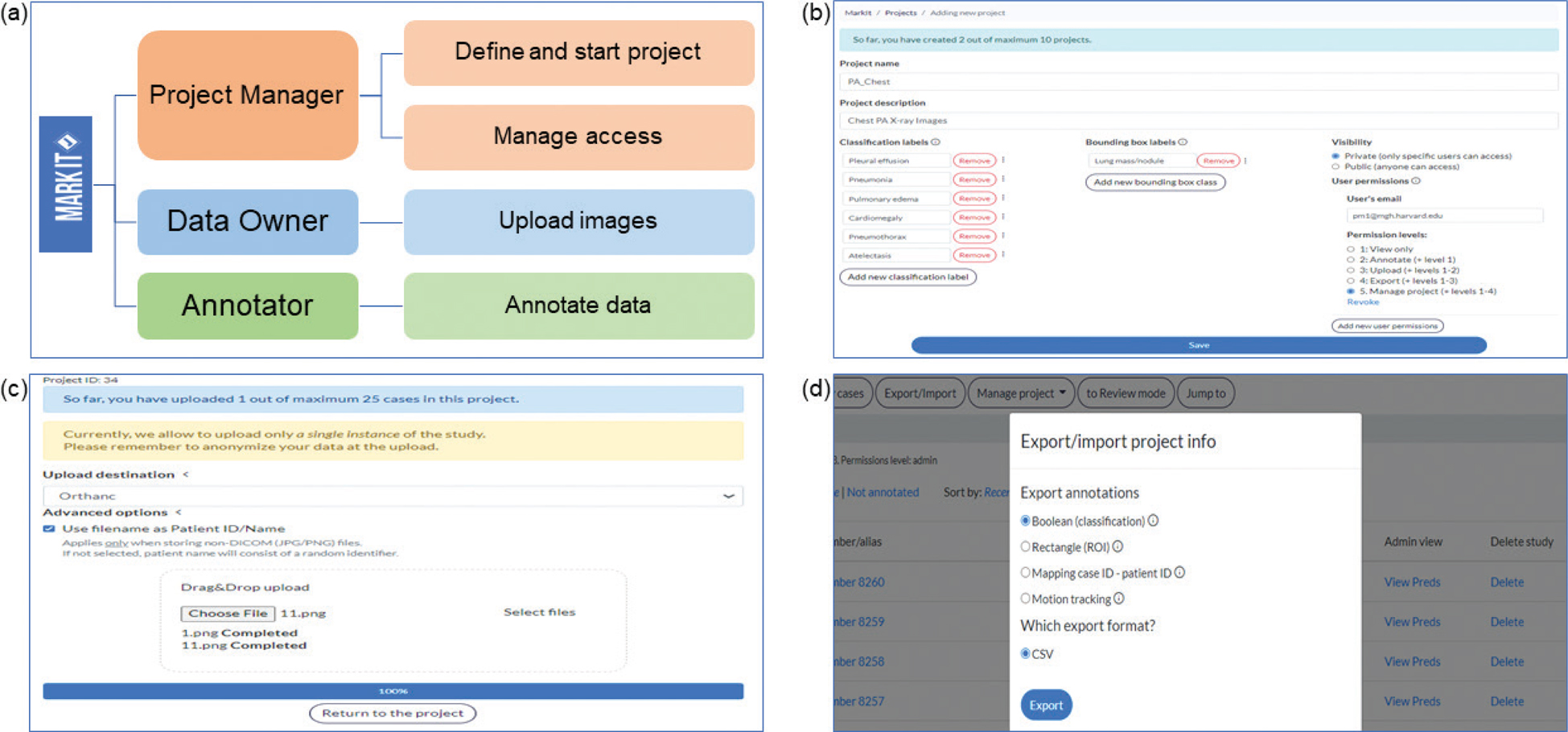 Fig. 3. Various stakeholders and their roles in managing large projects for scalable medical image datasets. (a) The platform described in this study facilitates workflow for all parties, maximizing their focus on a single part of the process, project managers defining the project and managing access levels, data owners on image upload, and annotators on labeling. (b) Project managers can coordinate projects by specifying labels in accordance with planned AI tasks, controlling visibility for all users, as well as granting and revoking permissions for annotators (c) Data owners can upload images with additional options for choosing desired data storage systems and file naming conventions. (d) Project managers can also export project-related data, including annotations by all team members and information about the time spent on labeling by users.