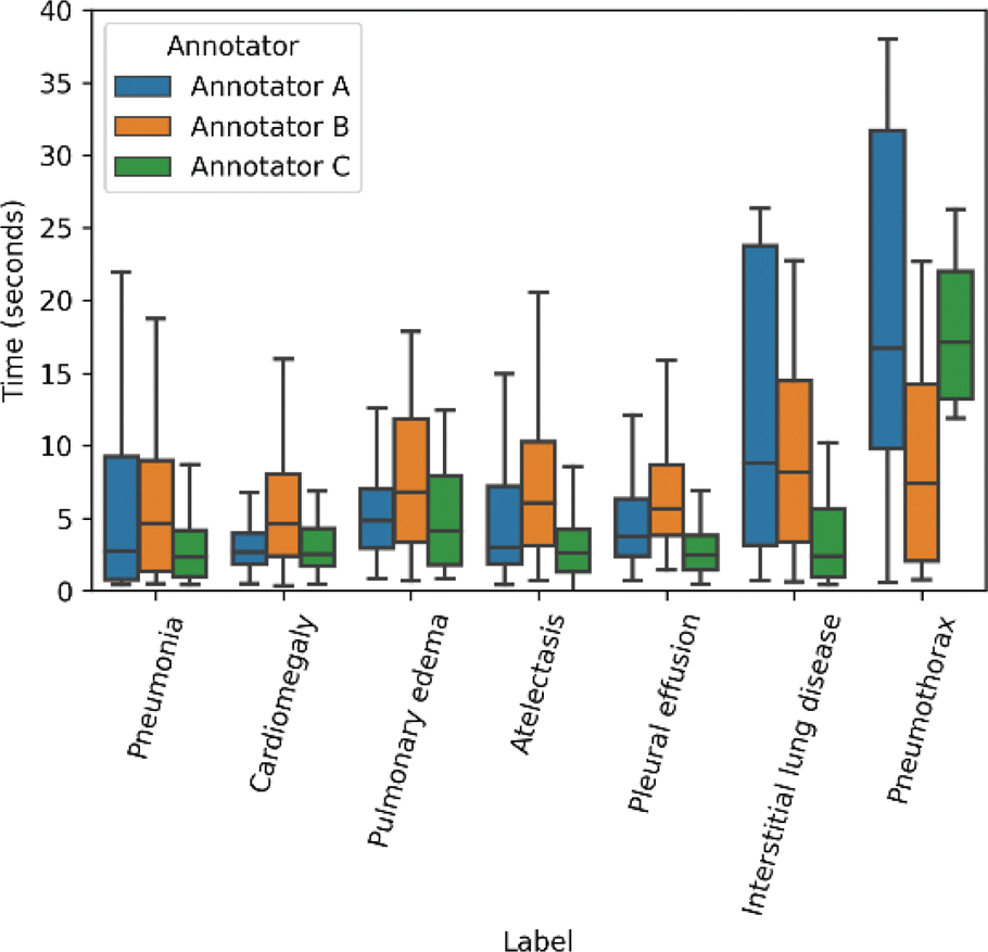 Fig. 4. Time distribution of each label and annotators. Annotator C spent the shortest time among the annotators for all labels, except pneumothorax. The pneumothorax labeling requires the longest time, in general, likely due to the use of ancillary tools such as zoom to view the pleural line, compared with the cardiomegaly cases requiring the shortest time.