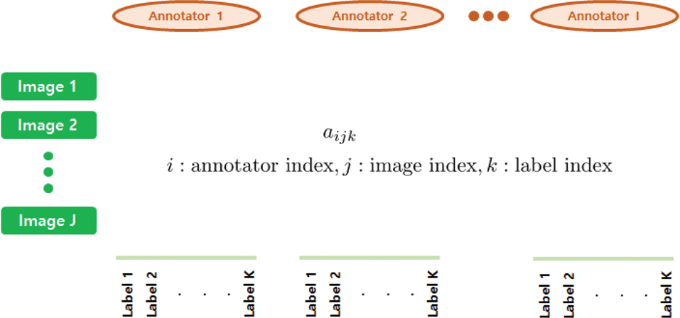 To evaluate the annotator’s contribution for CXR PA dataset, we exported the binary classification data and generated the annotation evaluation sheet consisting of True or False. As shown in Fig. 5, for the k-th label of j-th image, the i-th annotator’s annotation results (True or False) are recorded as aijk. We consider the seven labels (Fig. 4) for 1000 cases annotated by three annotators, so I=3, J=1,000, K=7. Using the table, we devise an Algorithm 1 to estimate each annotators’ contribution, level of challenge of each image and task, respectively, and to evaluate each annotator’s reward (Eq. 1).