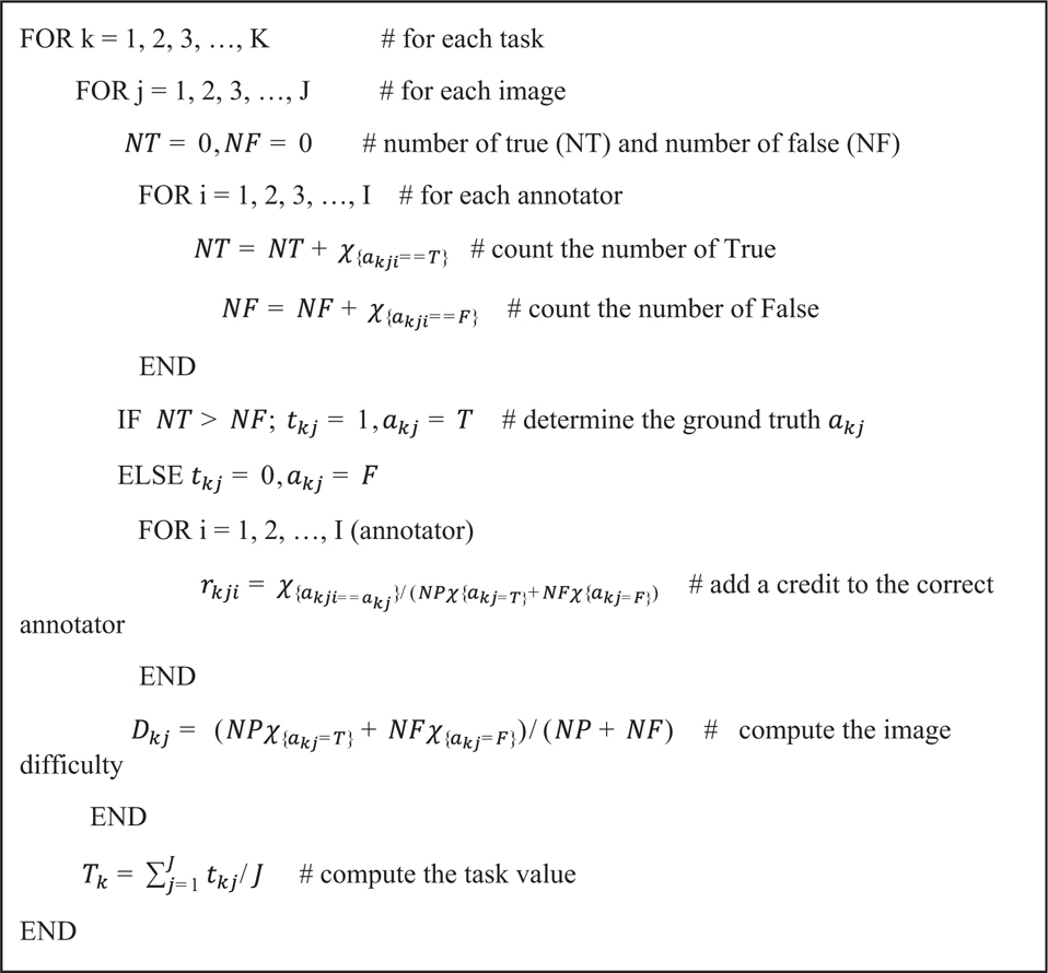 In Algorithm 1, we evaluate the contribution credit of i-th annotator for the k-th label of j-th image rkji, the value of k-th label of j-th image for data Dkj, and the task value Tk. Basically, the lower the correct answer rate, the higher the value of the image and task and the annotators’ contribution. We set the pseudo answer akj for the k-th label of j-th image and consider it as a ground truth for each task (k-th label of j-th image). To count the laboring factor, we put the normalized time mean for k-th label