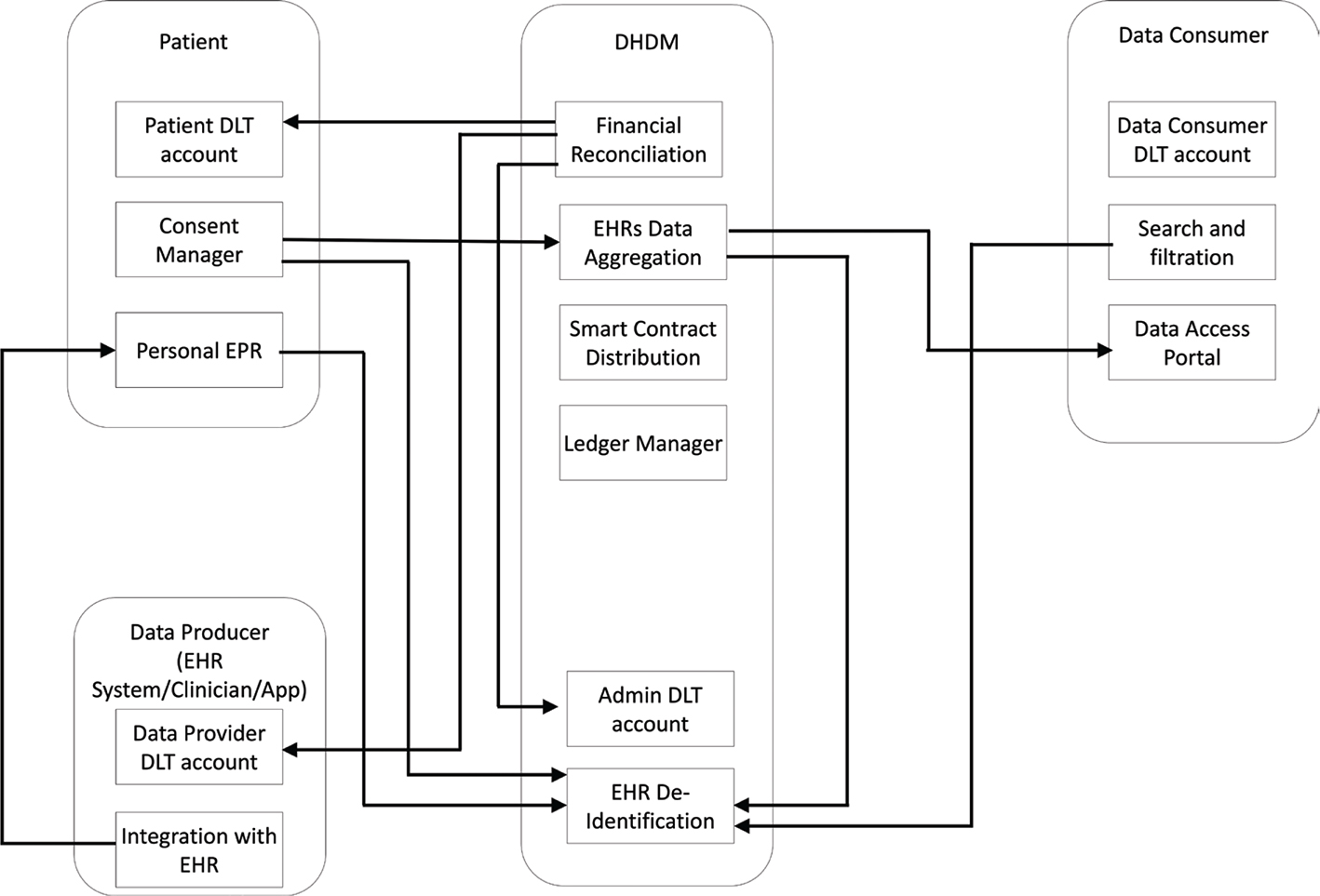 Figure 1. Four interfaces of the operational workflow of DHDM: Through the patient interface (top left) the patient sets their accounts, completes their electronic health record (EHR), and manages access control via giving consent to sharing their data with researchers of their choice. Through the data producer interface (bottom left), care providers and other data producers can create their accounts and manage linking patients to their local files through the caregiver’s information technology system. Researchers will set up their accounts, search for datasets, request access to data, and make payments for the data they access through the data consumer interface (top right). The back-end administration of the marketplace will be carried out through the DHDM interface, EPR (electronic patient record) and DLT (distributed ledger technologies).