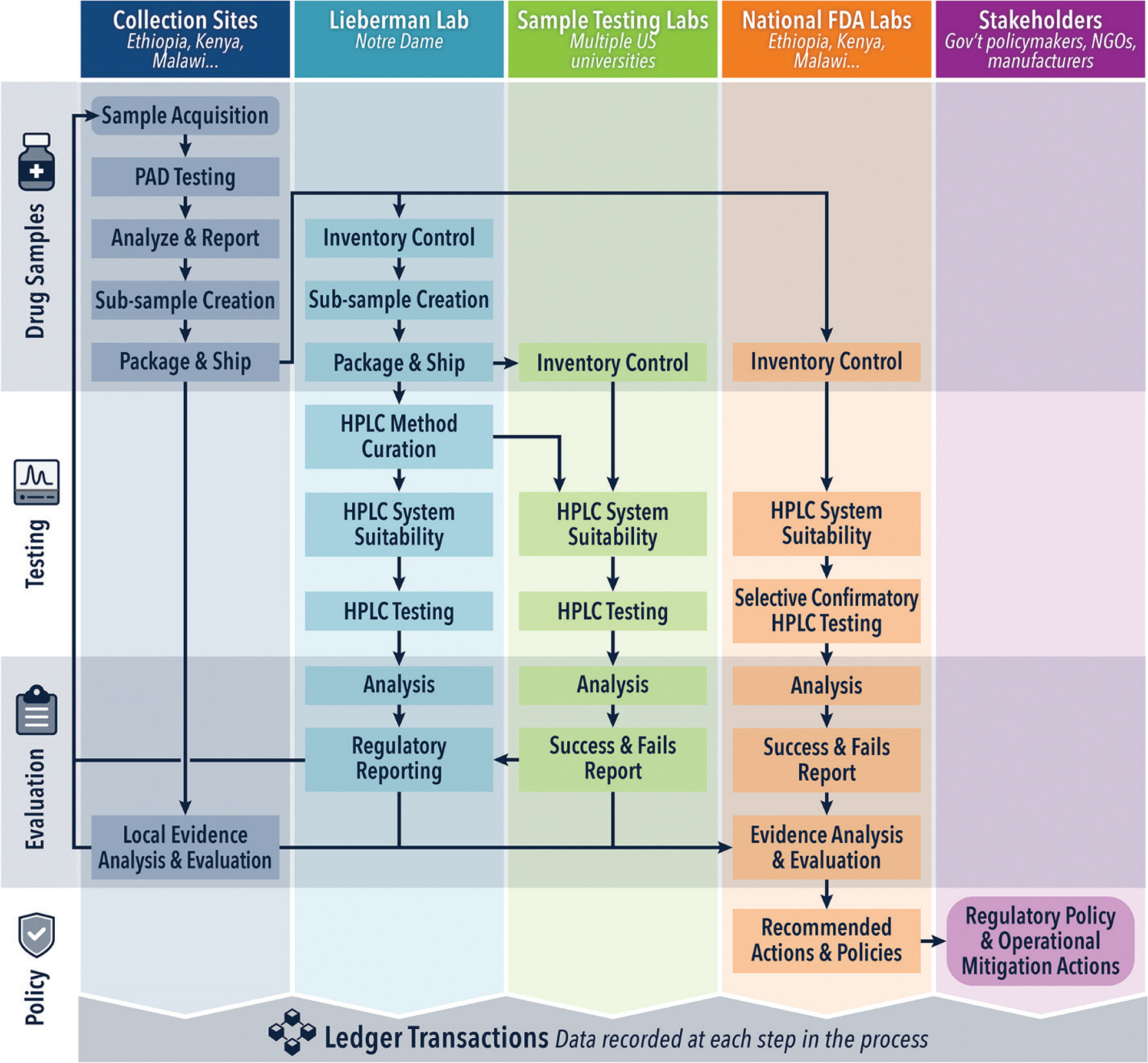 Pharmaceutical samples are acquired at collection sites such as the lab in Addis Ababa, screened at the point of collection, and distributed to multiple testing laboratories. Sample inventory and stage in workflow are monitored by the ledger. Instrumental analysis methods such as HPLC are curated at the University of Notre Dame, and quality control measures such as systems suitability tests and pharmaceutical assay data and results are recorded at multiple lab sites, such as at Roanoke College. Data analysis and regulatory reporting are facilitated by cross-site information sharing. At each stage, the ledger records who has custody of each sample, what tests have been performed, and what the results were.
