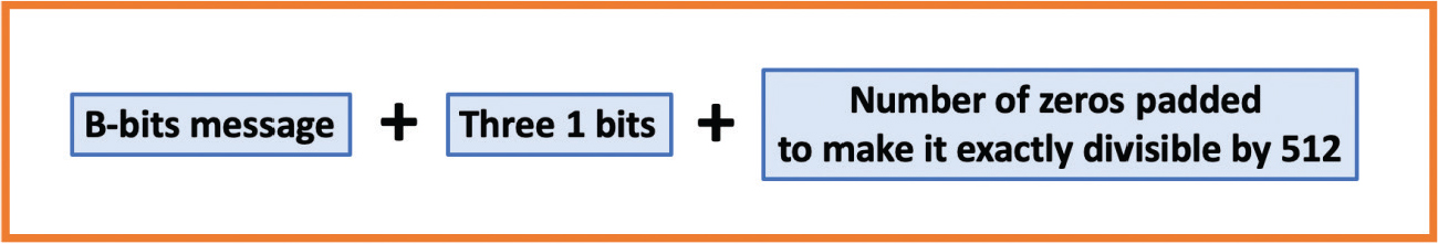 In the first step, a message of b-bits is padded to make it 16 bytes SHA (Secure Hash Algorithm), which is the multiple of 512. The first three “1” bits are appended to the input message, and then a series of off bits are padded, as given in Figure 2.