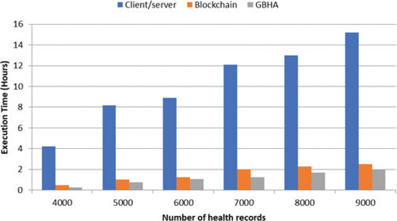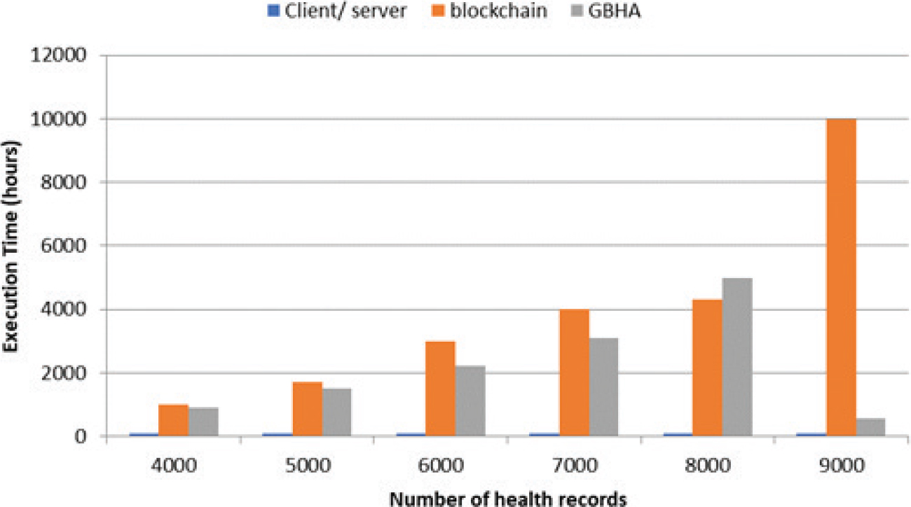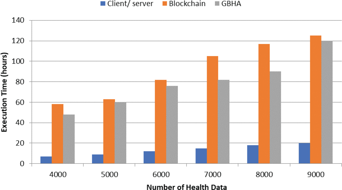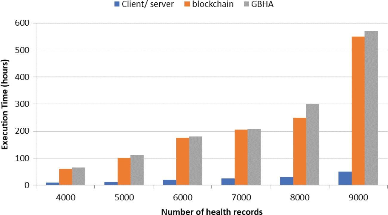Figure 5 represents the execution time for upgrading the health records using a minimal blockchain model from [GBHA], client/server, and the model development in this paper. It represents the graph has a linear relationship between blockchain systems and client/server.37,38