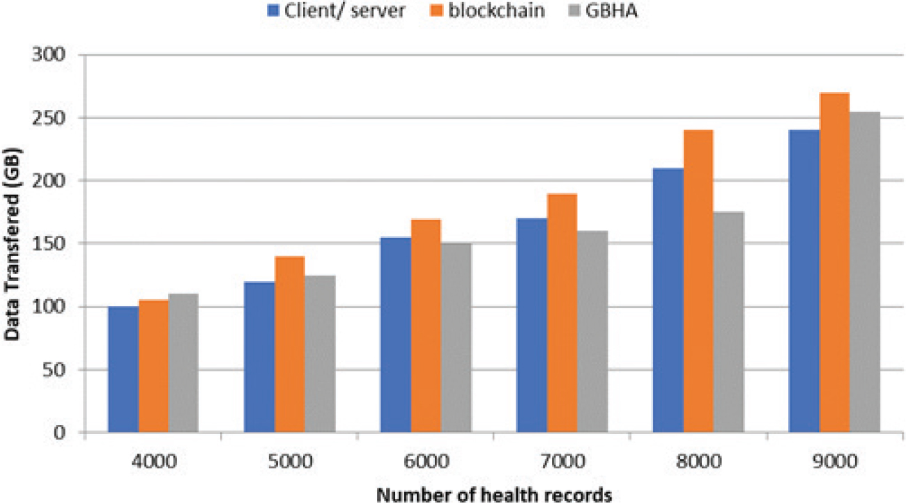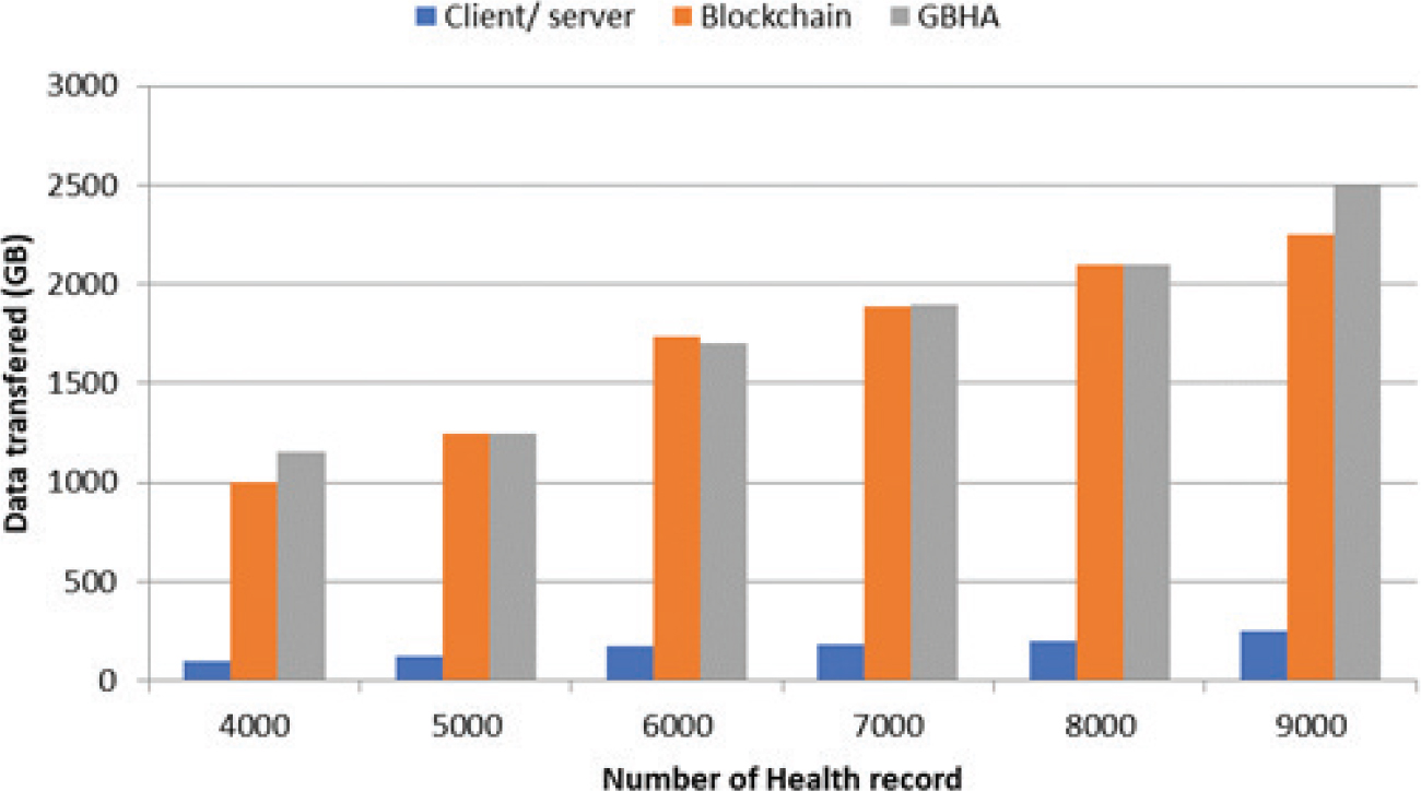 Figure 6 represents the relationship between data transfer and the number of health records in the client model and blockchain models. This is repeated in Figure 2. It has been shown in the graph that the data transmission through blockchain is more compared to the client-server system because every updated health record is forwarded to the rest of the network peer node by creating more data transmission. Additionally, all peer nodes forwarded the block’s data, including the hash, to the rest peers in the network and boosted the transmission of data, and generated the request. In the blockchain, the execution time is due because, for the data, the query is forwarded to all nodes in the network.