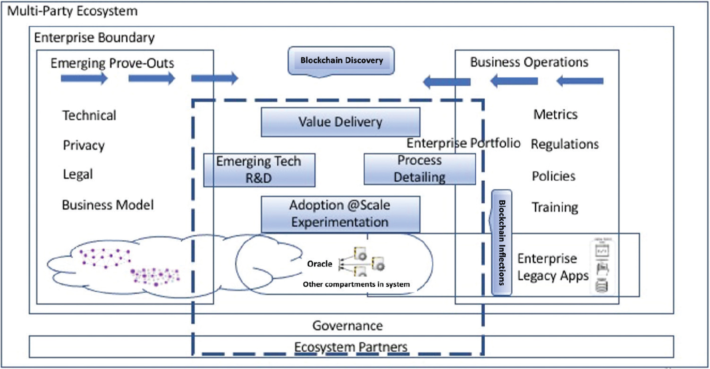 In the initial stages, some of our efforts were also a broad-stroke assessment of the application of blockchain technology, with high-level assumptions on how it could be used and technology-based prove-outs. Several use cases were proposed, and technical component development started with little comprehensive understanding of the full ecosystem level functional context, business and enterprise architecture, organizational and change management aspects, and possible inter-enterprise friction and technical and business scale adoption factors. The results were remarkably similar to what was reported.2 This typically causes frequent starts/stops, loss of confidence, and threatens sustainable innovation resulting from our earlier cycles.