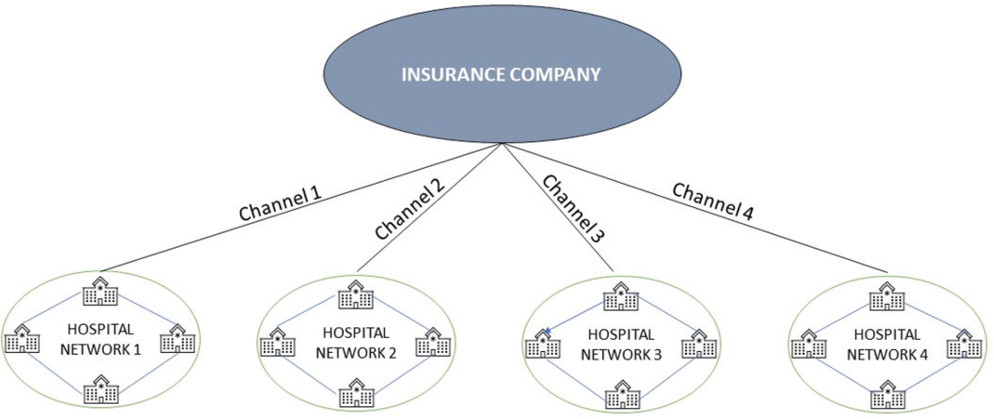 4. Channel: Four channels connect the peers of the five organizations (the IC and the four HNs). Each channel has a chaincode deployed on it. Hence, each channel is governed by the respective pre-agreed business logic or policy as per the smart contract. Then, the ledger functions are initiated on these smart contracts. When a specific organization wants to conduct business transactions privately, Its peers join the channels separately.