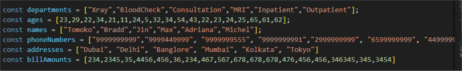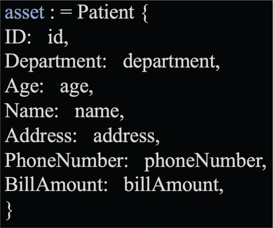 We consider the basic details of the patients that are needed from hospitals by insurance companies in the following way (Figure 5). The basic data structure consists of patient ID, department, age, patient name, address, phone number, and bill for services.