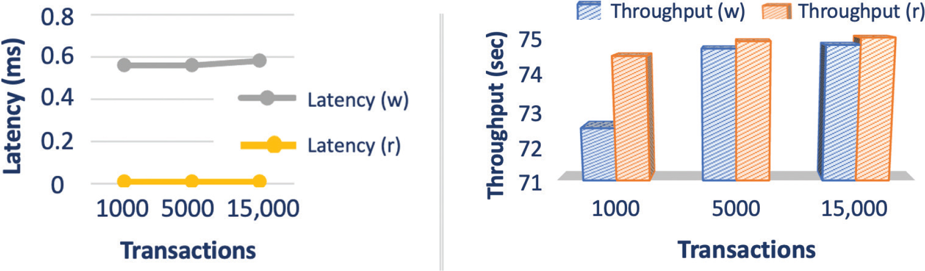 Fig. 8. Evaluation of the impact of transaction numbers, TPS (transactions per second) = 75 from Tables 2 and 3, Org (organization) numbers = 5: Latency and Throughput in Create and Write operations.