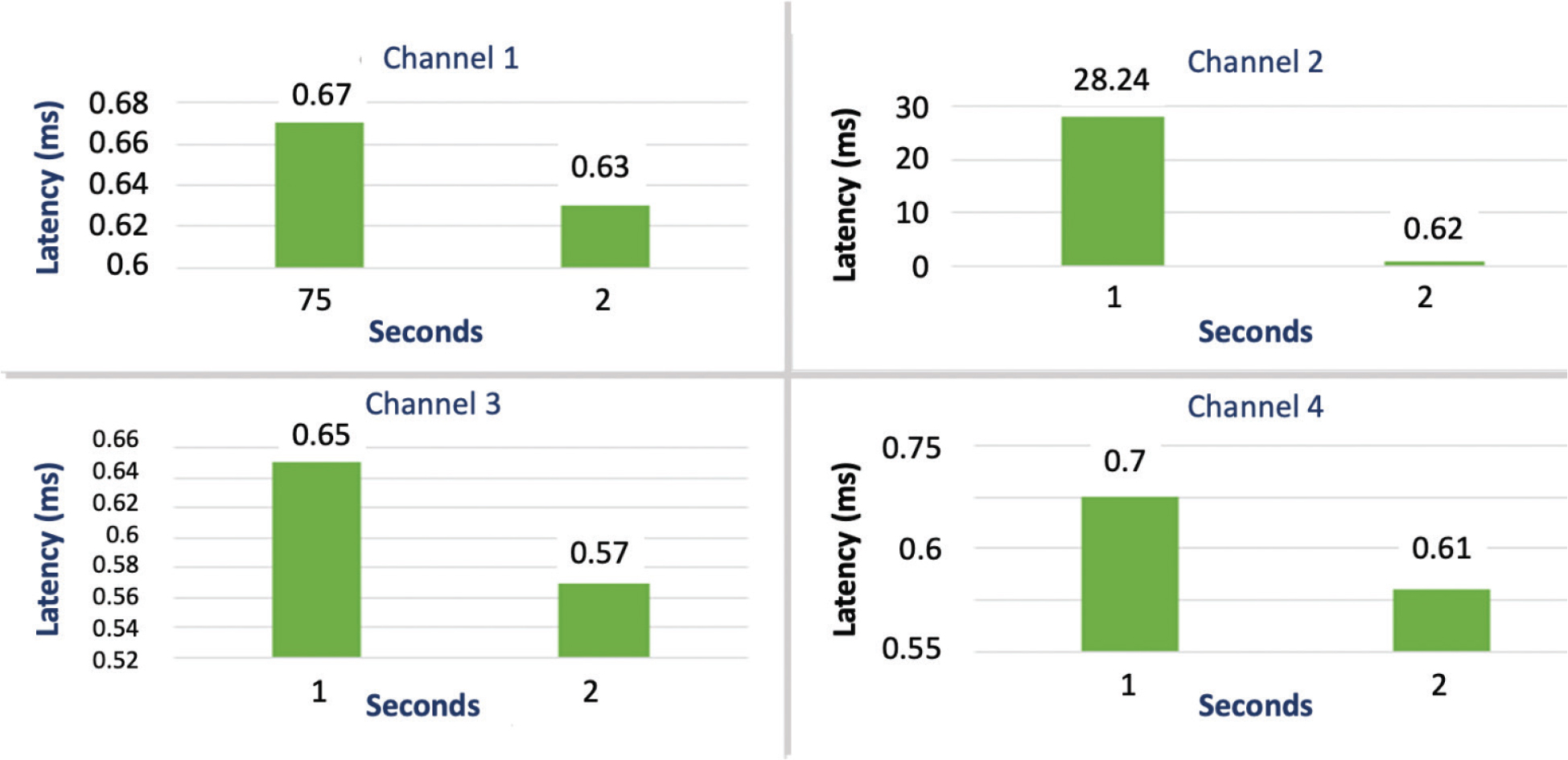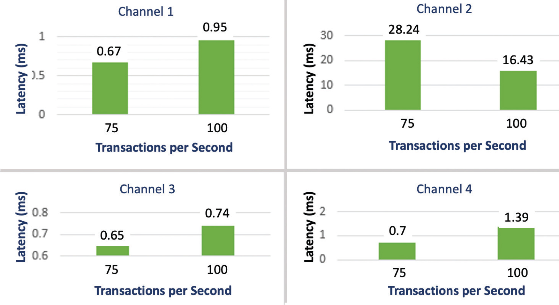 Fig. 12. Evaluation of block interval (1s and 2s) for TPS = 75 (Tables 11 and 15) in Write operation with the number of channels increase from 1 through 4. TPS: transactions per second.
