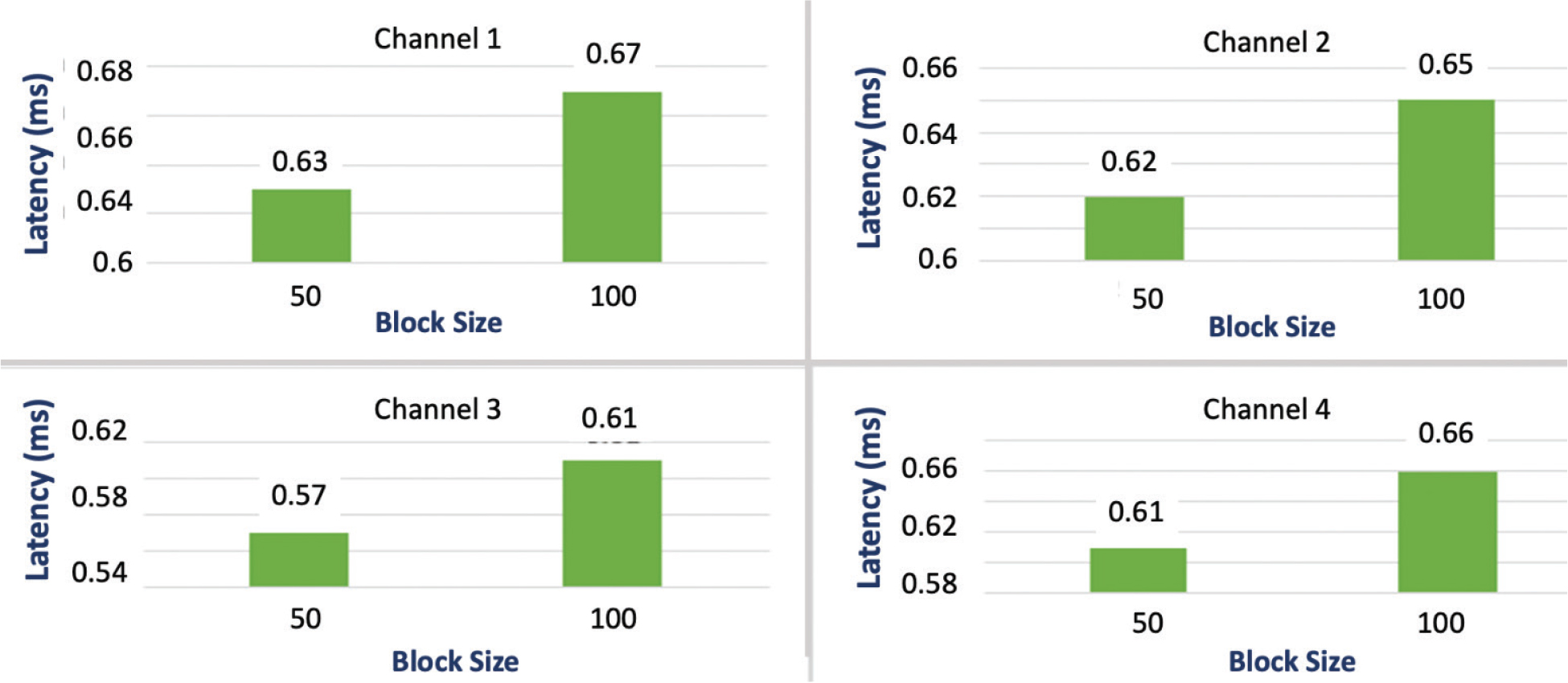 Fig. 13. Evaluation of block size (50 and 100) for TPS = 75 (Tables 13 and 15) in Write operation with the number of channels increase from 1 through 4. TPS: transactions per second.
