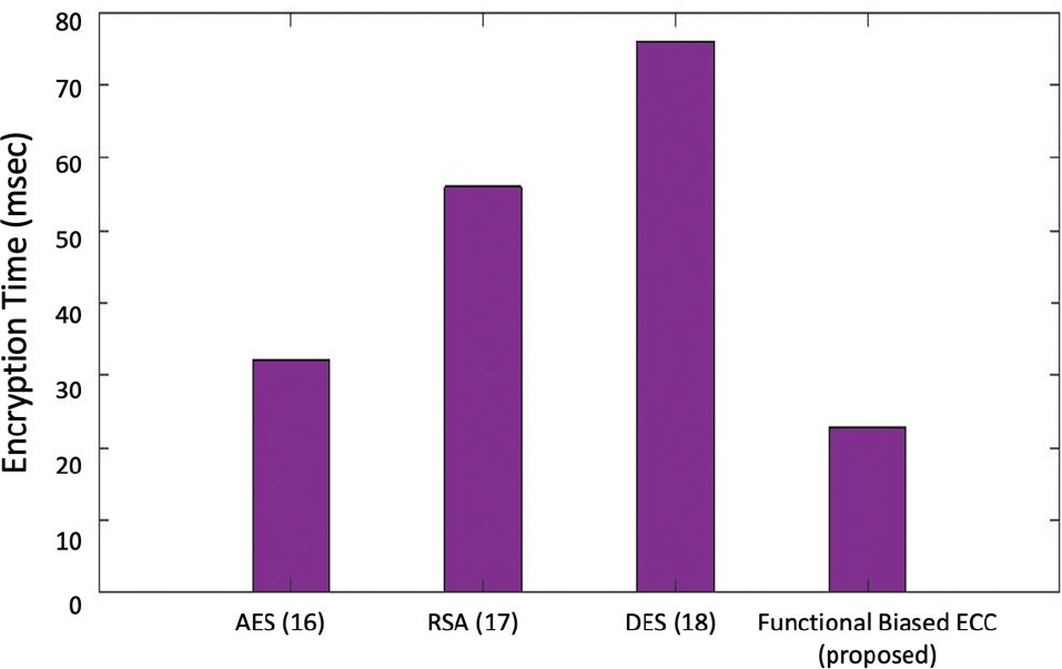 Figure 3 displays the suggested technique’s encryption time utilizing the functional biased ECC method. Researchers discovered that encryption time improved as the number of bits in the key became larger. Our suggested architecture, on the other hand, takes much less time to encrypt than traditional approaches like Advanced Encryption Standard (AES), Data Encryption Standard (DES), and Rivest-Shamir-Adleman (RSA).