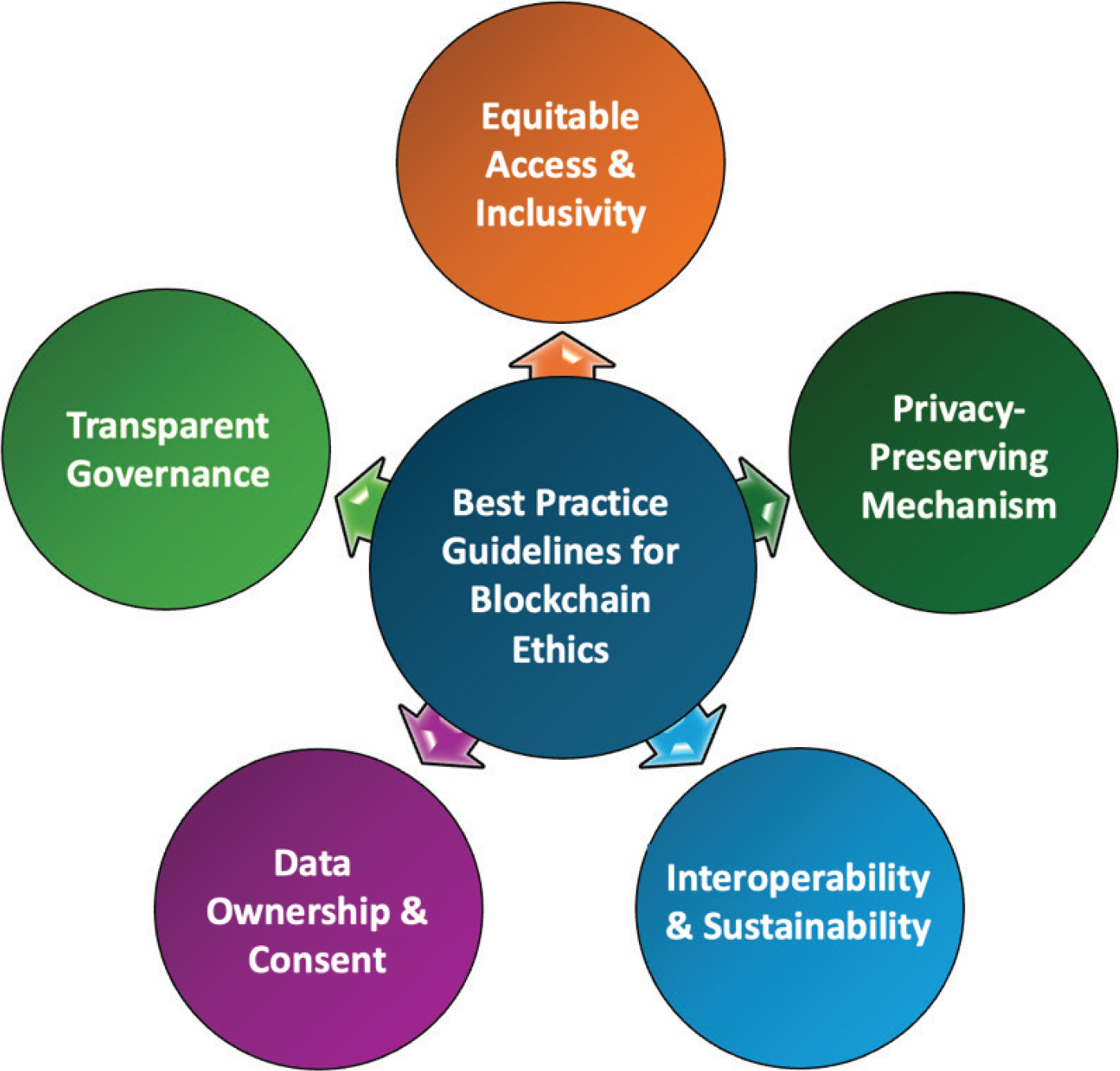 Fig. 2. Best practice guidelines for blockchain ethics illustrating the interconnected framework, highlighting key ethical dimensions and practices.