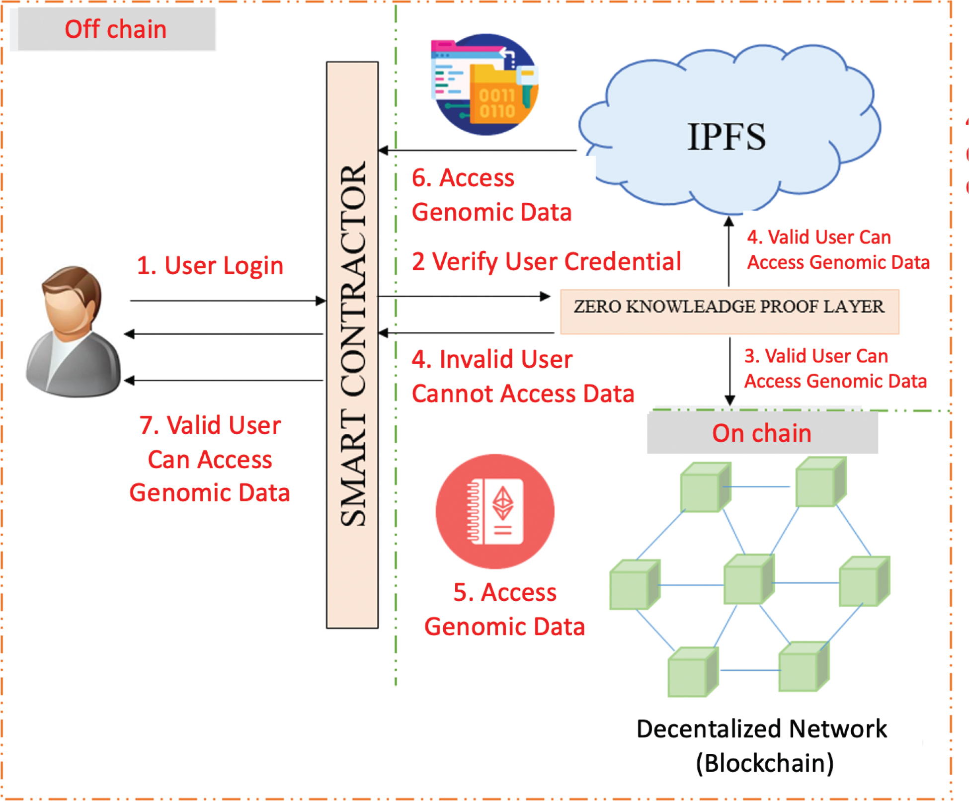 The real data will be stored on the IPFS network. If the user requests to access the genomic data, then the smart contract is invoked to manage and secure future access to the genomic data. On receiving an access request for the genomic data by a user, identification of the user and permission verification are done by the smart contract. For privacy, it employs a ZKP system whereby the user can prove identity and authorization without revealing sensitive data. It grants access upon successful authentication and denies access upon failure. Optimized efficiency methods are used to optimize the signed queries.