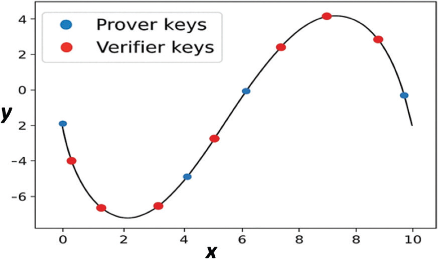 This diagram charts ECC points, highlighting the correlation between public and private keys used in ZKP protocols. There are two sets of points in the scatter plot: Figure 4, prover keys are marked by blue points, which are computed based on private key values, and verifier keys are marked by red points, computed using their respective public values. The curve is employed graphically to demonstrate the asymmetry and non-reversibility of ECC operations; that is, although it is computationally easy to calculate a public key from a private key, its reverse cannot be performed, the source of which is cryptographic security.