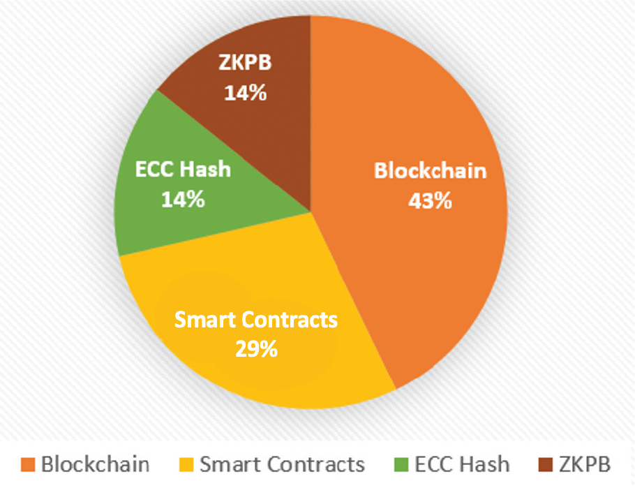 Figure 8 presents relative computational overhead (1 = low, 3 = high). Both ZKPB and ECC are low complexity (1) using constant-time cryptography despite ZKPB’s computationally heavy proof creation. Smart contracts are medium complexity (2) using access list checks proportional to the user base. Blockchain is high complexity (3) for linear block scanning of 500 blocks, consistent with sequential search requirements. These results confirm the optimality of ZKPB for privacy-requiring applications.