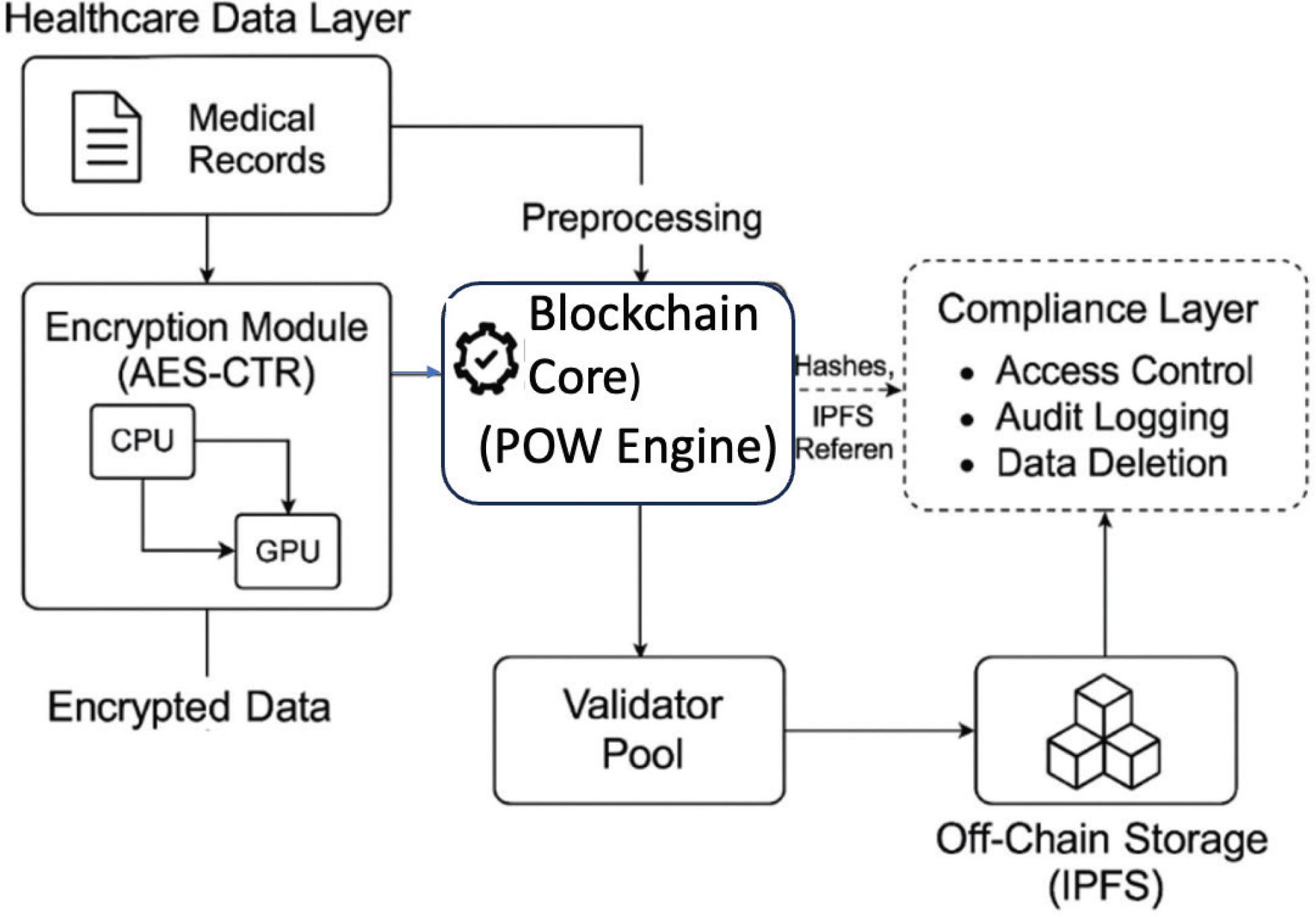 Figure 1 illustrates the system architecture for the CUDA-accelerated blockchain: healthcare data are encrypted via GPU-accelerated AES-CTR, recorded in the blockchain core through PoW mining, stored off-chain using IPFS, and verified by a validator pool. The compliance layer ensures GDPR and HIPAA alignment.
