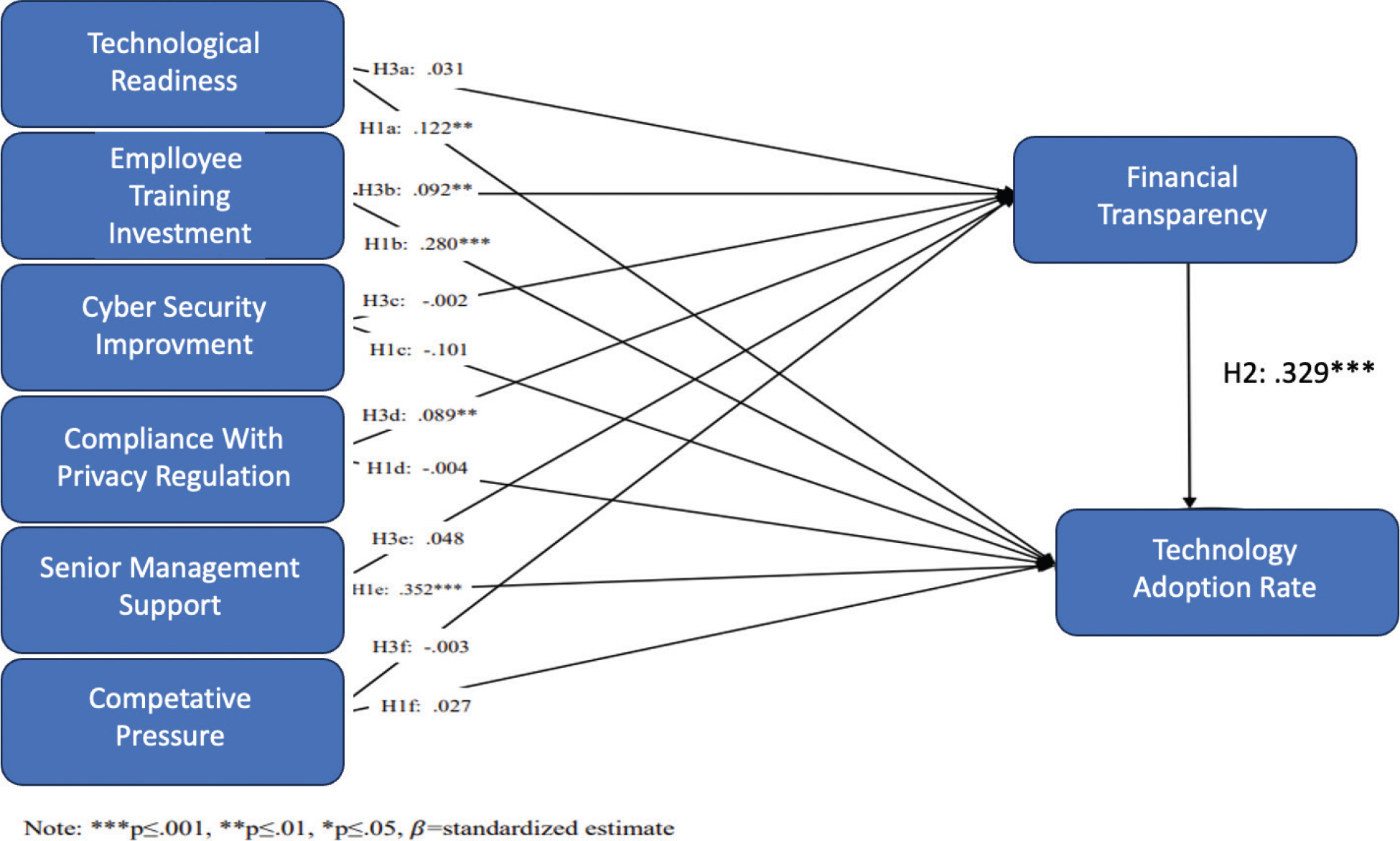 Regarding the indirect pathways through financial transparency, employee training investment (β = 0.092; p = 0.003) and compliance with privacy regulation (β = 0.089; p = 0.002) showed significant mediation effects, supporting hypotheses H3b and H3d. Meanwhile, other indirect paths—technological readiness, cybersecurity improvement, senior management support, and competitive pressure—were not significant, leading to the rejection of hypotheses H3a, H3c, H3e, and H3f.
